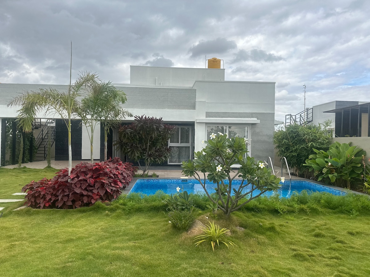 ¡Escápate a este refugio de alta tecnología de 2 dormitorios y cocina a solo 1 hora de Bangalore! Perfecto para teletrabajar, hacer una fiesta o disfrutar de una escapada romántica. Aspectos destacados: 🏊 Piscina privada: piscina de 20 x 12 pies + césped de 300 pies cuadrados. 🎬 Noches de cine: proyector en patio + Smart TV. 🔒 Privacidad total: puerta automática y paredes extendidas. 💻 Preparado para trabajar: wifi de alta velocidad y purificador de aire. 🍳 Cocina completa: barbacoa, nevera, microondas y agua descalcificada. Entrega de comida a través de Swiggy/Zomato. ¡Se admiten mascotas! 🐾 Horario sin ruidos: 22:00-6:00