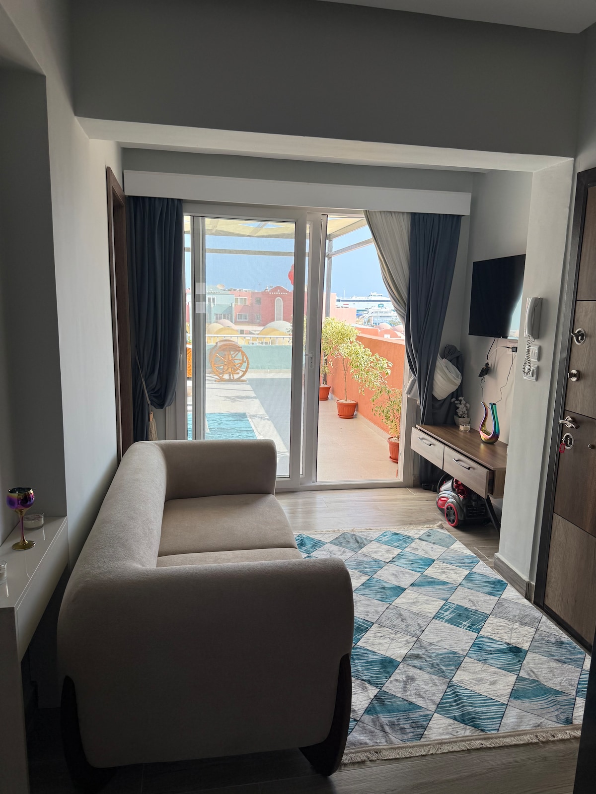 Disfruta de una estancia de primera categoría en el puerto deportivo de Hurgada. Apartamento nuevo en la azotea con 2 dormitorios, aire acondicionado en todas las habitaciones, cocina totalmente equipada, wifi rápido, TV inteligente y terraza privada grande con vistas al mar, perfecto para el café de la mañana, el atardecer y el trabajo a distancia. Los restaurantes, bares y el paseo marítimo están a 1 minuto. No se admiten visitantes locales. Solo huéspedes registrados.