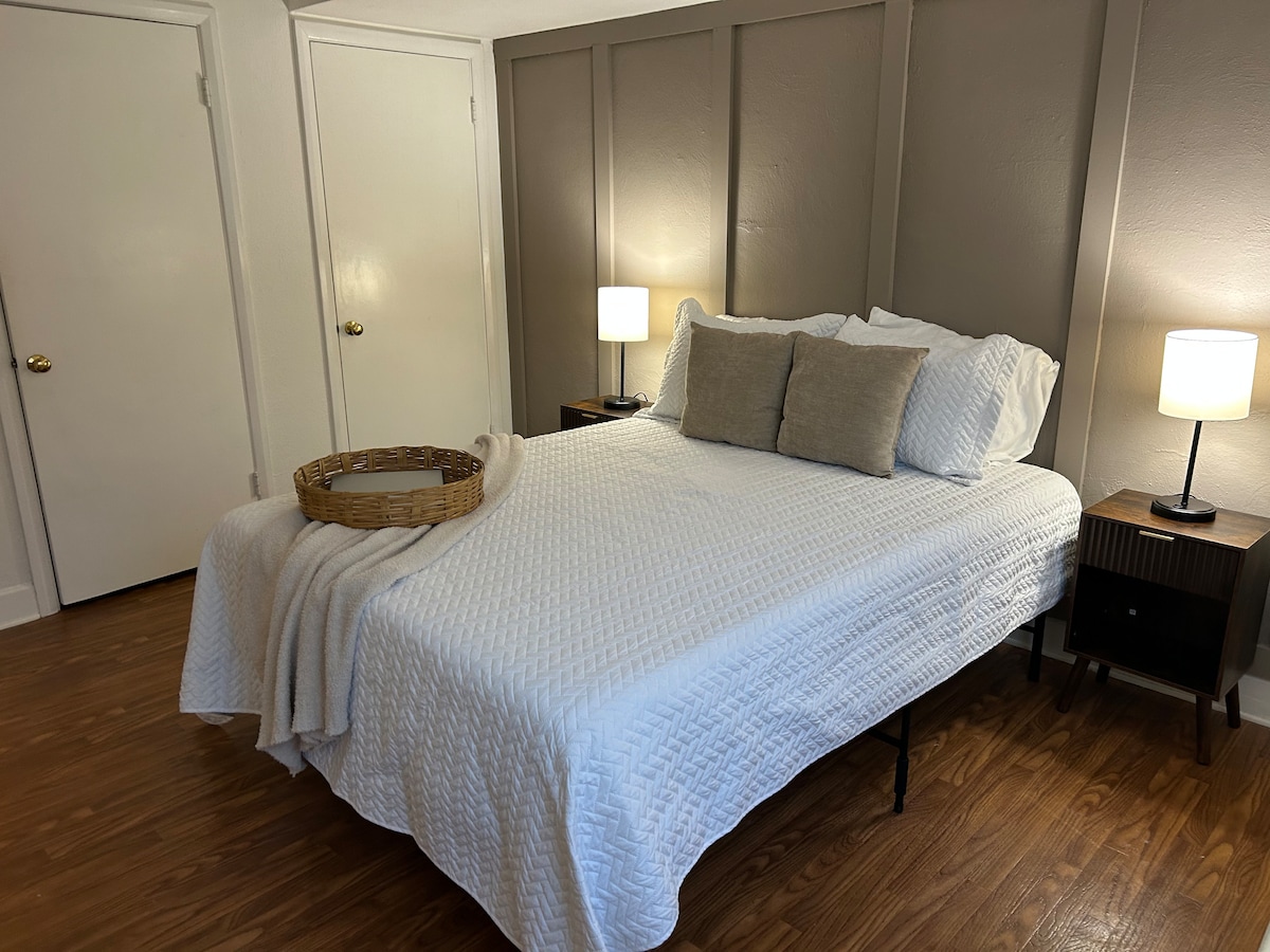 Hermoso, espacioso y privado patio trasero con columpio en el porche, columpio en el árbol e iluminación al aire libre. Incluye cocina americana con nevera/congelador, Keurig, microondas, tostadora, horno de convección pequeño (lo suficientemente grande como para cocinar una pizza congelada), así como un pequeño suministro de aperitivos/artículos para el desayuno. Precioso baño de azulejos con bañera con patas. Sofá y sofá de dos plazas para relajarse. Hulu y Netflix incluidos, así como juegos de mesa/cartas. Incluye área de escritorio para estudiar/trabajar.