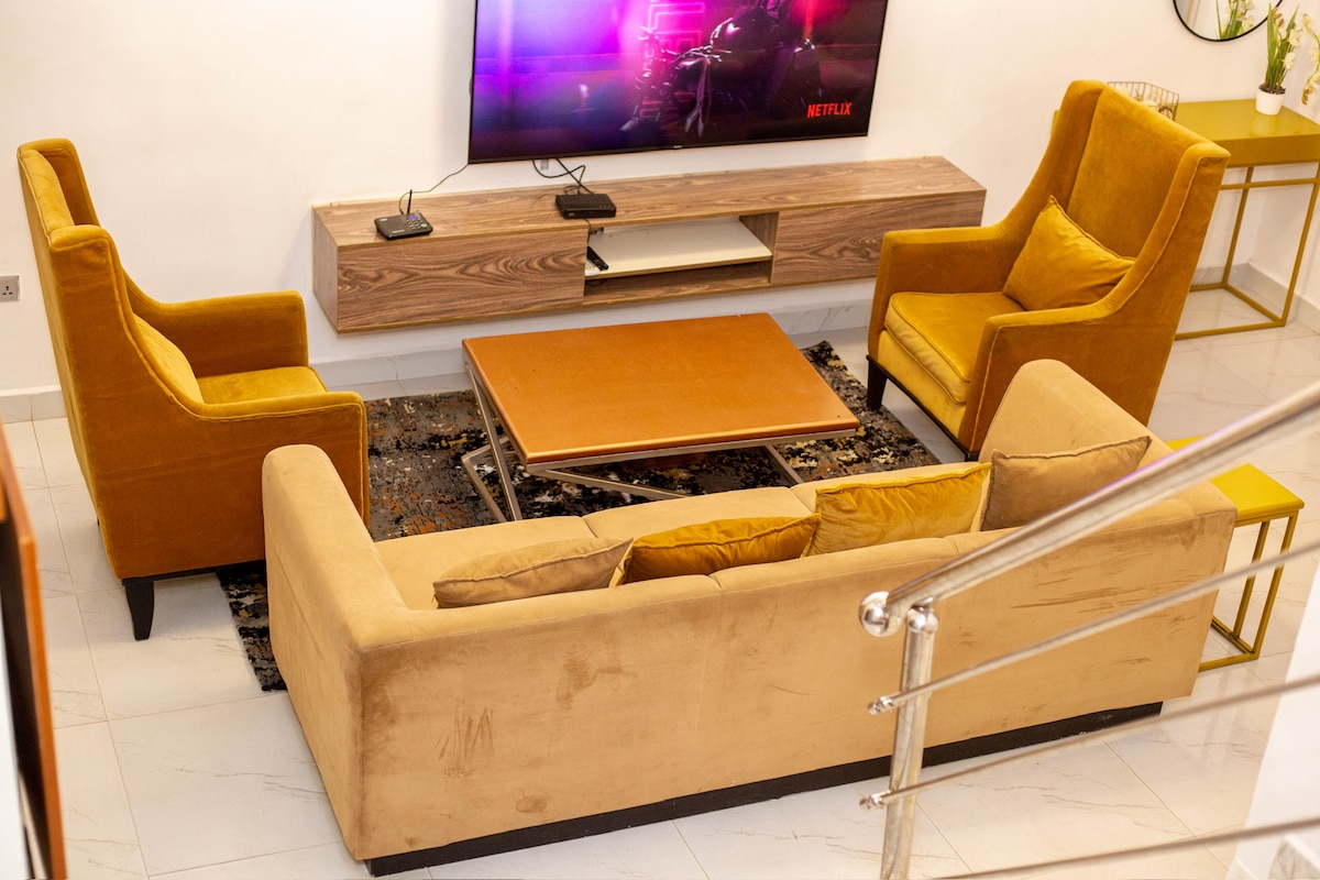 Este moderno apartamento de 1 dormitorio está convenientemente situado en el siempre bullicioso Bodija, el centro de negocios de Ibadán. A 10 minutos en coche del University College Hospital, a 10 minutos de la gran Universidad de Ibadan, a 15 de la Politécnica, a 10 de Ibadan POLO CLUB y a 25 del aeropuerto de Ibadan. Disfruta de buena electricidad, con un inversor de 1,5 KVA, aires acondicionados, suministro de agua, Smart TV de 45 pulgadas y DSTV proporcionados.