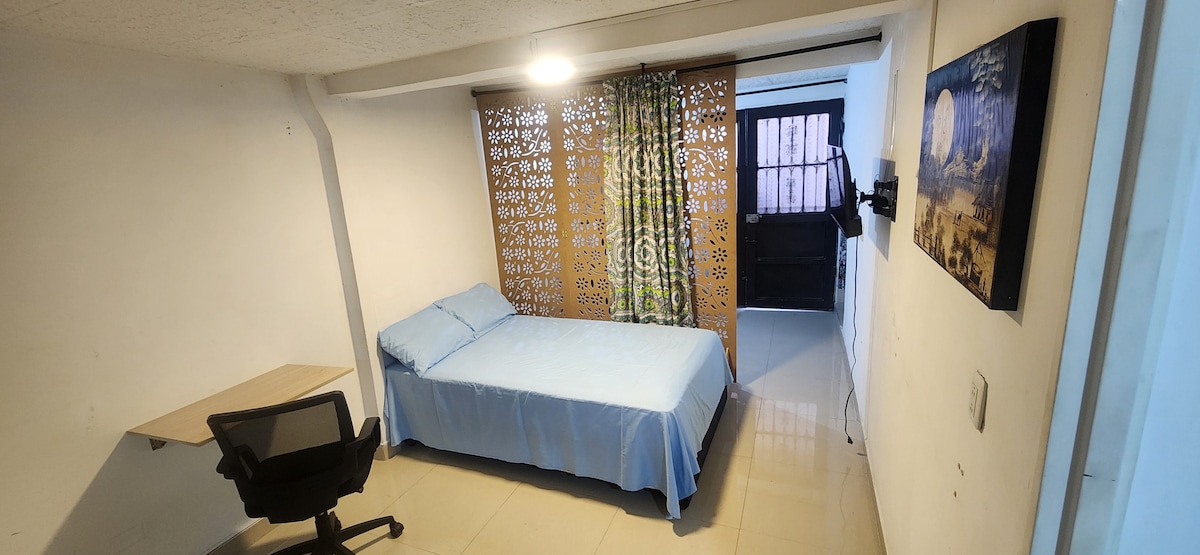 Disfruta de la sencillez de este alojamiento tranquilo y céntrico, donde encontrarás tu cocina independiente dotada, tu baño independiente y servicio de parqueadero para motos pero si traes tu carro a solo 3 cuadras encontraras parqueadero público 24h, también contamos con zona de lavado con lavadora a tu servicio.