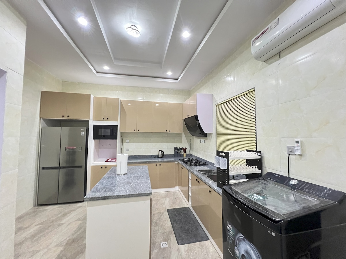 Te damos la bienvenida a un alojamiento diseñado para ofrecer una experiencia perfecta tanto en el interior como en el exterior, con piscina, cenador, zona de lavandería, bar con televisión y una pequeña zona de fitness para realizar entrenamientos ligeros. En el interior, disfruta de una sala de estar con una smart TV de 65 pulgadas y asientos de cuero. Los dos dormitorios tienen baño en suite, con baños modernos y una presión del agua excelente. La cocina está equipada con fogones y campana extractora. Hay wifi rápido y conexión por cable, y la electricidad está disponible las 24 horas, los 7 días de la semana. Un guardia de seguridad y un portero están siempre a su disposición.