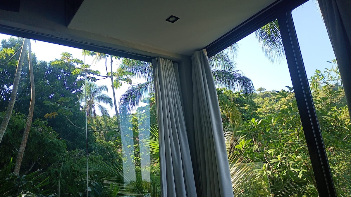 Desconecta y relájate en medio del bosque atlántico, en un condominio con seguridad 24 horas, a 300 m de Praia do Viana y a 6 minutos de Vila. La suite independiente, integrada con un encantador contenedor de casa, ofrece privacidad, comodidad y contacto con la naturaleza. Balcón gourmet equipado y una cama tamaño queen para noches perfectas. Registro de entrada automático con cerradura digital, aire acondicionado, baño de agua mineral calentada a gas ("cascada caliente"), cascada de agua fría, a 20 m de una cascada natural privada y 1 asiento.