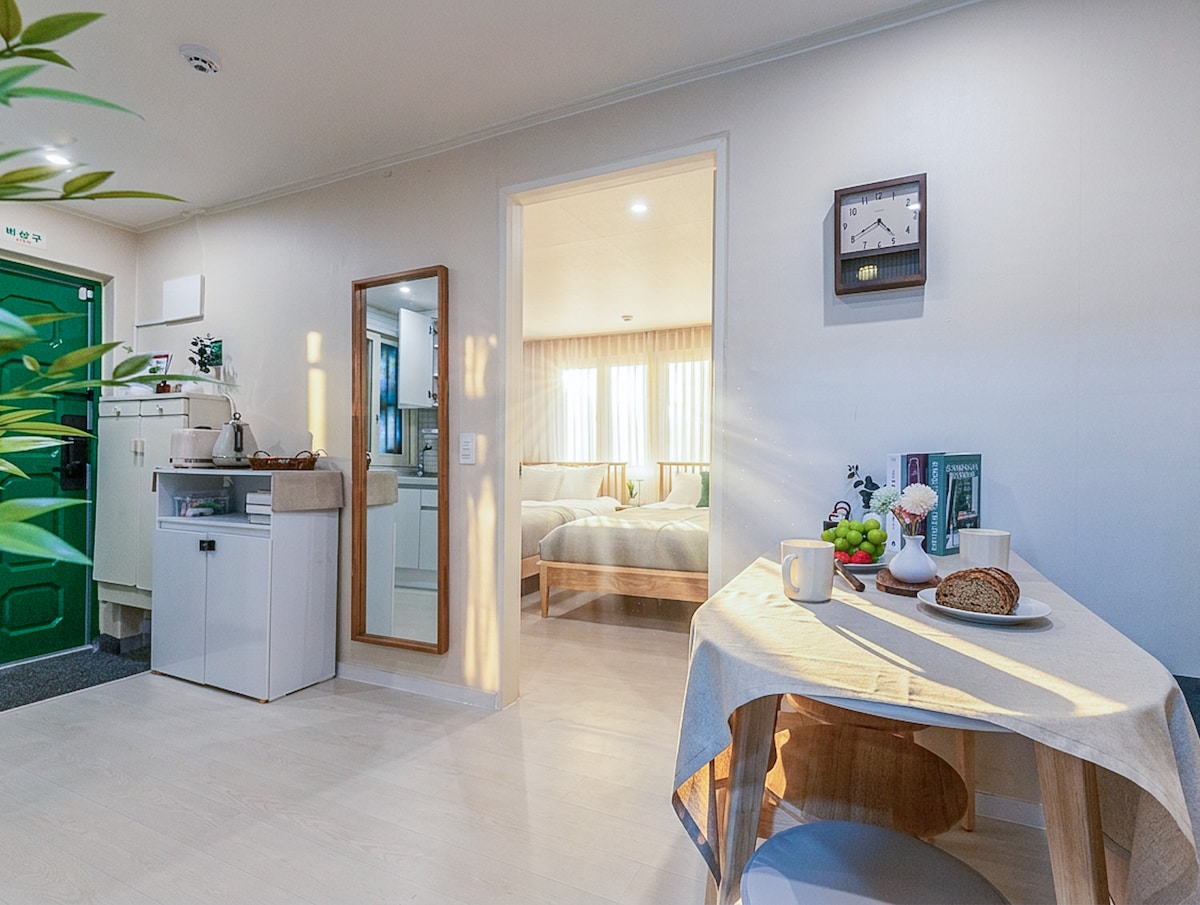 💜 Esta es una casa tranquila en el segundo piso de un edificio nuevo. 💜 Ofrecemos un alojamiento de calidad con un concepto limpio y encantador a un precio razonable. Espacio espacioso y agradable de💜 23 pyeong. Cama y ropa de cama de estilo hotelero. Comedor independiente con mesa grande para 6 personas. Smart TV de 50 pulgadas (puedes ver tu cuenta personal en YouTube, Netflix y Teabing) No se permiten 💜 huéspedes adicionales. Desalojo inmediato sin reembolso si se descubre (no se permite el acceso a visitantes) ※ Consulta con el circuito cerrado de televisión en la entrada común. Al reservar para 💥1 o 2 personas: Elige entre 1 o 2 dormitorios (1 dormitorio básico incluido) Otro dormitorio cerrado Cargo adicional de 30 000 KRW por noche para ambos dormitorios 1 y 2 💥 Para 3 personas: 1 dormitorio + 2 dormitorios (cama super individual) 💥 Para 4 personas: 1 dormitorio + 2 dormitorios (super individual + cama individual)