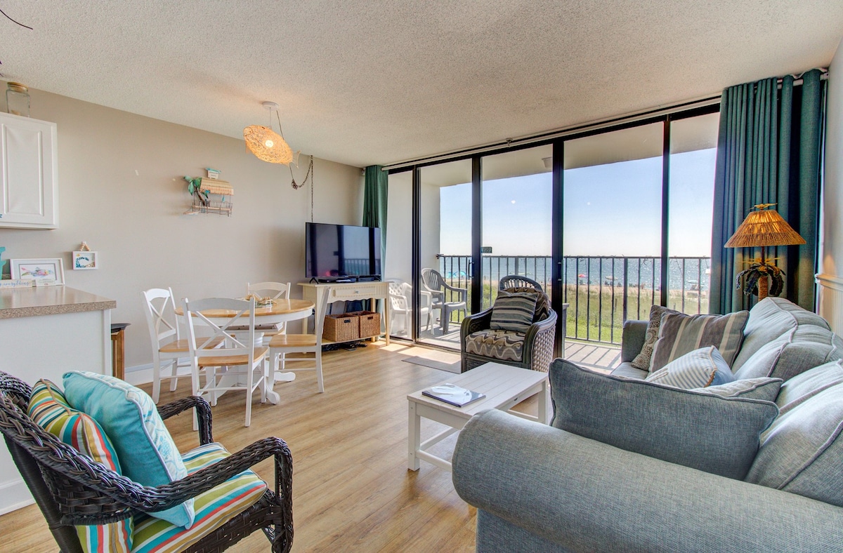 Hermoso condominio ubicado en el Caravelle Resort en Myrtle Beach, SC, todas las comodidades del hogar con una gran dosis de AIRE SALADO añadido para esa escapada relajante definitiva, plano de planta abierto, dormitorio privado con cama KING size con vestidor, baño privado, salón comedor abierto, el salón tiene una cama Murphy de tamaño completo, cocina completa con fogones, nevera, microondas, iluminación colgante sobre la barra, balcón privado con hermosas vistas al mar.