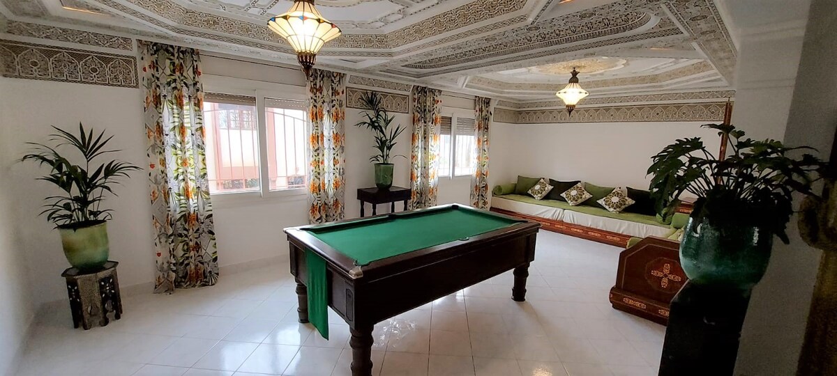 Une note de fraîcheur pour la chambre Essaouira comprenant 2 lits 90x200 et une salle de d'eau attenante. Vous pourrez profiter de 2 salons à disposition de nos hôtes : un salon billard et un salon jeux / lecture. Nous vous proposons le petit déjeuner sur la terrasse à l'ombre d'une jolie pergola et si vous souhaitez farnienter, les transats vous attendent ! Au plaisir de vous accueillir !