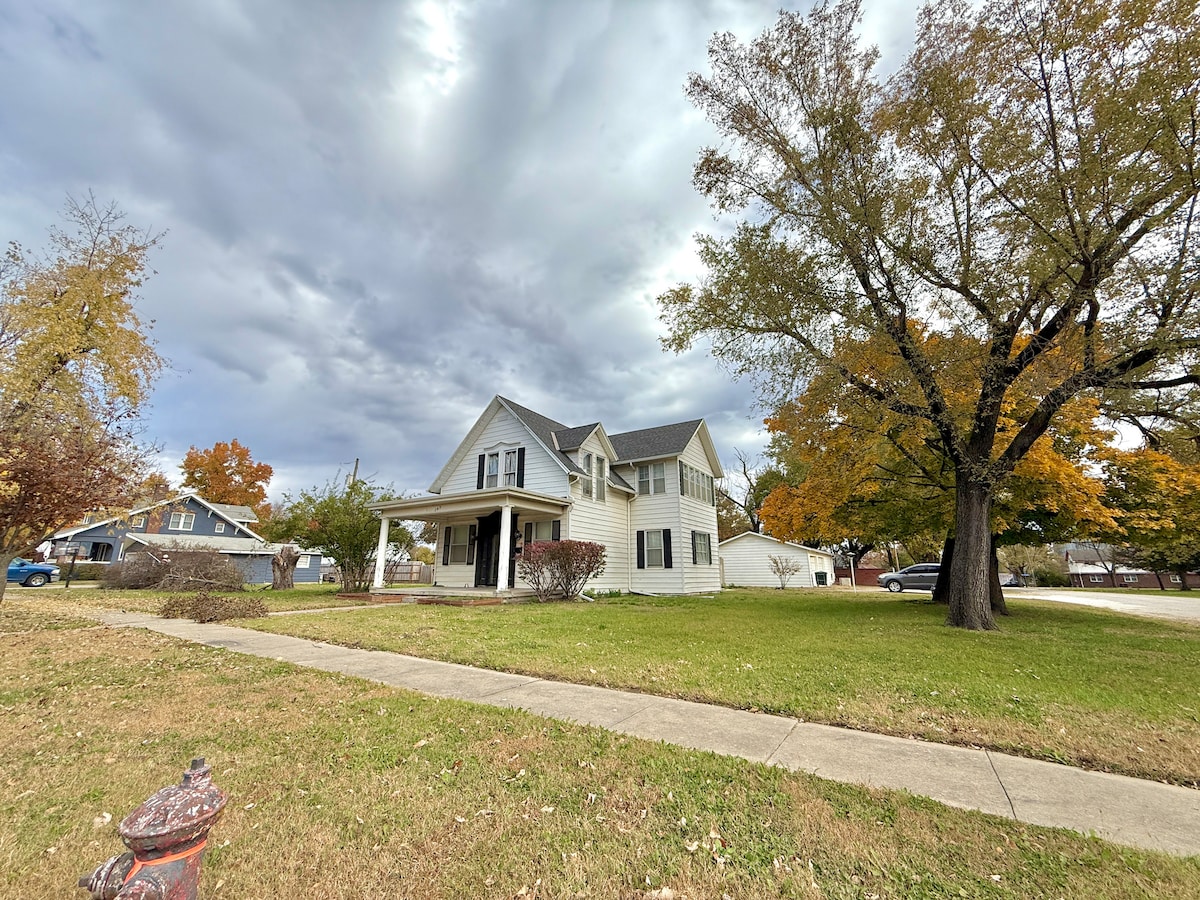 Relájate con la familia en nuestro bungalow de 100 años, de una sola planta. Ofrecemos 3 dormitorios con capacidad para 6 personas. El interior está recién remodelado, incluyendo nueva calefacción y aire acondicionado central. Todavía estamos arreglando el exterior. Disfruta del tranquilo barrio mientras te relajas en el gran y acogedor porche delantero. Nuestra casa está a 3 manzanas de la plaza más grande de los Estados Unidos. También está a poca distancia en bicicleta de los senderos Lehigh Portland y del parque estatal Prairie Spirit Trail. Iola es el hogar del Allen Community College.