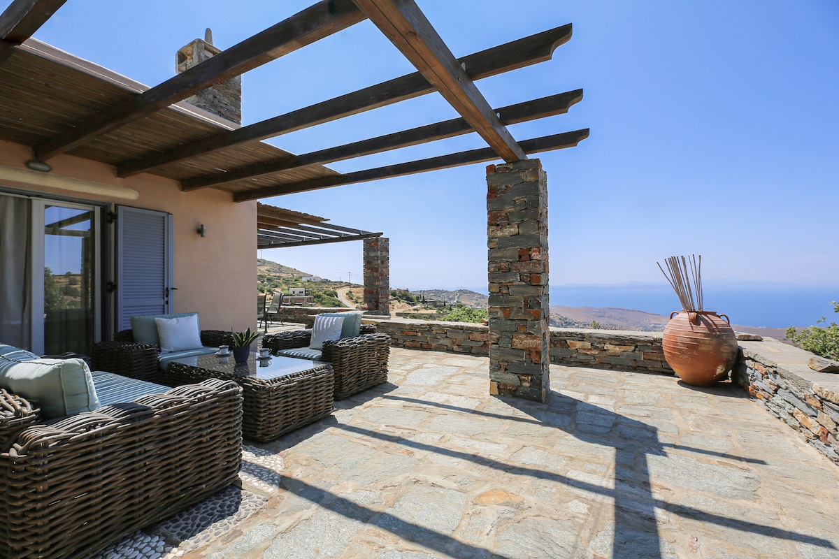 Una villa recién construida de 100 metros cuadrados justo encima de Ioulida (la capital tradicional de la isla, conocida como Chora), con impresionantes vistas a Chora y al impresionante azul del mar Egeo. Está construido con la arquitectura tradicional tziotiki, con terrazas de piedra por todas partes hechas de piedra local y aparcamiento privado. Ubicado en una zona de 4000 m2 con robles, ofrece un alojamiento amplio y cómodo para un máximo de 6 personas.