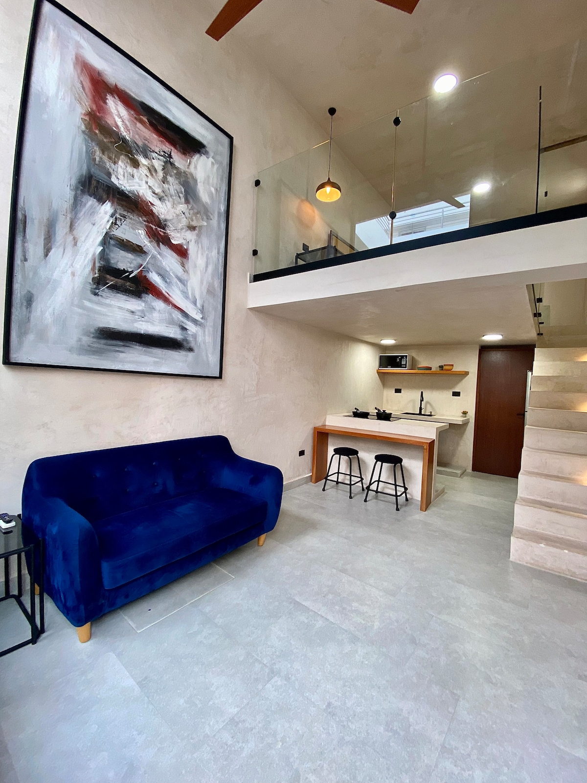 Relájate en este espacio tranquilo y elegante. El estudio Antonieta es un cómodo espacio que cuenta con los elementos esenciales para hacer de tus vacaciones un momento inolvidable. Se encuentra en un área a mitad de la isla lejos del ruido y barullo de la zona comercial pero cerca del principal atractivo de la isla: su hermoso mar Caribe. Disfruta de hermosos atardeceres en la piscina de su fabuloso rooftop y relájate viendo el azul del mar Caribe y de su cielo desde sus amplias ventanas.