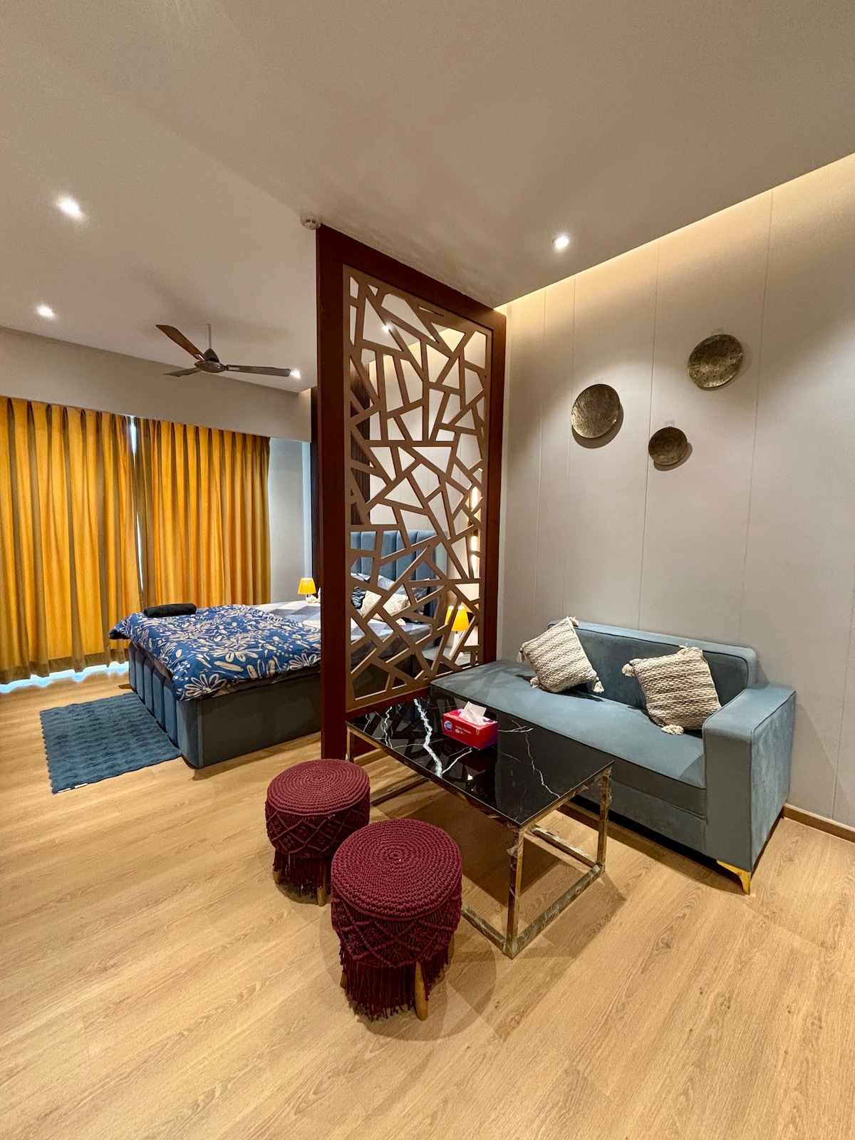 Bienvenido a este apartamento tipo estudio de hermoso diseño situado en el corazón de Greater Noida West. Perfecto para personas que viajan solas, parejas o huéspedes de negocios, este estudio ofrece una estancia cómoda con todas las comodidades modernas. Lo que te va a encantar: Habitación amplia y bien iluminada con una lujosa cama tamaño queen. Elegante diseño de techo con iluminación ambiental y elegantes ventiladores. Smart TV con configuración de entretenimiento y asientos acogedores. Comodidad con aire acondicionado. Balcón privado. Nevera Baño limpio y moderno.
