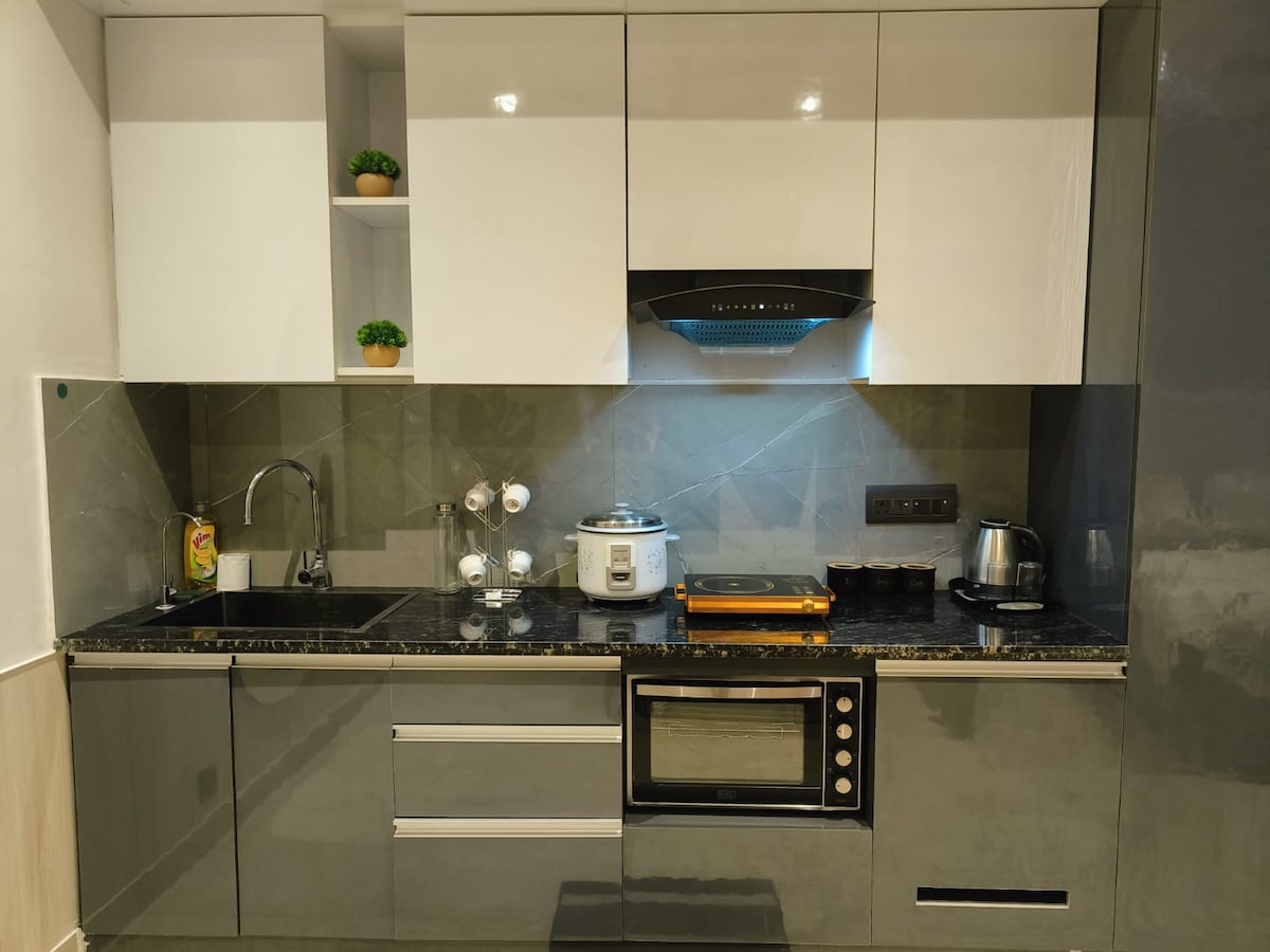 Nuestro apartamento de 2 dormitorios de nueva construcción combina la comodidad moderna con el encanto natural. El espacio cuenta con 2 dormitorios serenos con camas tamaño queen, una amplia sala de estar, una cocina bien equipada, 2 baños: uno adjunto al dormitorio principal y otro accesible desde la sala de estar y el segundo dormitorio y un balcón en forma de L que ofrece excelentes vistas de la ciudad. ¡La propiedad se encuentra cerca de un centro comercial prémium en Noida! Esta ubicación bien situada te ofrece la comodidad de tiendas, cafeterías y entretenimiento.