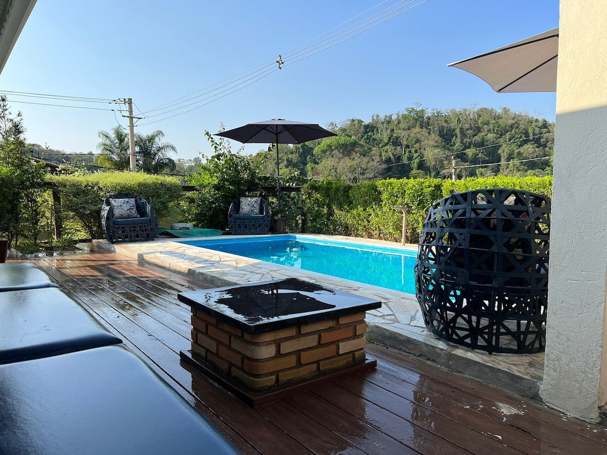 Sobrado con 430 m² en condominio cerrado, 5 suites con aire acondicionado, 4 habitaciones, lavabo, wifi, Smart TV 65", Home Theater, cocina equipada y lavandería. Amplio balcón, con vistas al atardecer, barbacoa, estufa de leña, cervecería, máquina de hielo, congelador, hamacas, mesas con 6, 8 y 12 asientos, sofás, terraza de contemplación y fogata en el patio trasero. Zona de piscina con sauna seca y mini patio de césped con huerto. Ideal para fines de semana y vacaciones con familiares y amigos (a 50 minutos de Marginal Pinheiros).