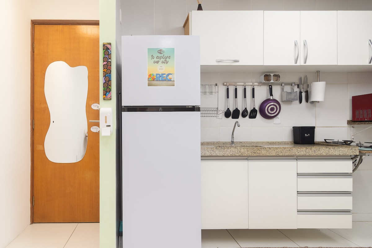CON VISTA AL MAR, este hermoso AP puede alojar a cuatro personas -tiene una cama doble y un sof sofá cama- y parece un pedacito de cielo, ya que desde un solo lugar se puede oír el ruido de las olas del mar en medio de la noche, despertarse al amanecer con el canto de los pájaros, disfrutar de mucho verde y aún admirar a los niños jugando en el parque. ¡Está ubicado en el corazón de la hermosa playa de Boa Viagem y está cerca de todo! ¡Siéntete como en casa y disfruta de este lugar increíble, cálido e inolvidable!