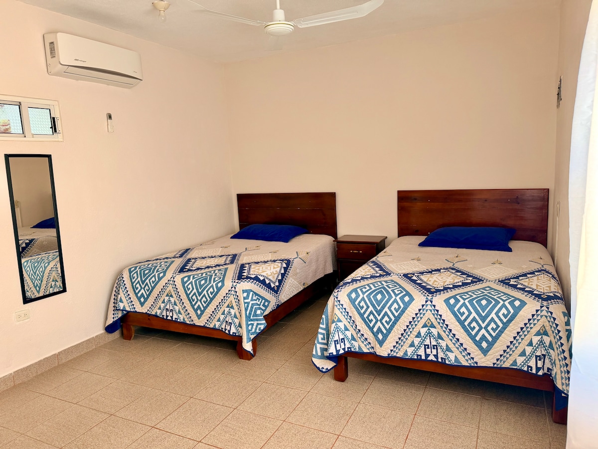 Departamento pequeño pero acogedor, ideal para una estancia cómoda y funcional. Cuenta con una recámara con dos camas matrimoniales, aire acondicionado y TV , perfecta para descansar después de un día largo. Incluye una cocina equipada con todo lo necesario para preparar tus alimentos, con un comedor práctico para disfrutar de tus comidas. Además, dispone de un baño completo con agua caliente disponible en todo momento. Pensado para brindarte comodidad, practicidad y una estancia agradable.