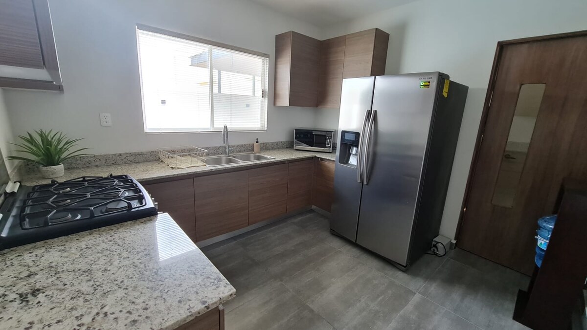 🏡 Acogedora casa en fraccionamiento seguro 🔐 🛏️ 2 recámaras con minisplit, abanico de cielo y 📺 Smart TV (Netflix) — Recámara 1; 1 cama matrimonial 🛌 Recamara 2.- 2 individuales 🛏️. 🚿 1.5 baños | 🛋️ Sala con Smart tv| 🍽️ Cocina equipada con refri, microondas, horno eléctrico, cafetera y utensilios. 🧺 Cuarto de lavado con lavadora y secadora. 🚗 Estacionamiento para 1 auto y entrada autónoma 🔑. Ideal para familias o estancias de trabajo.