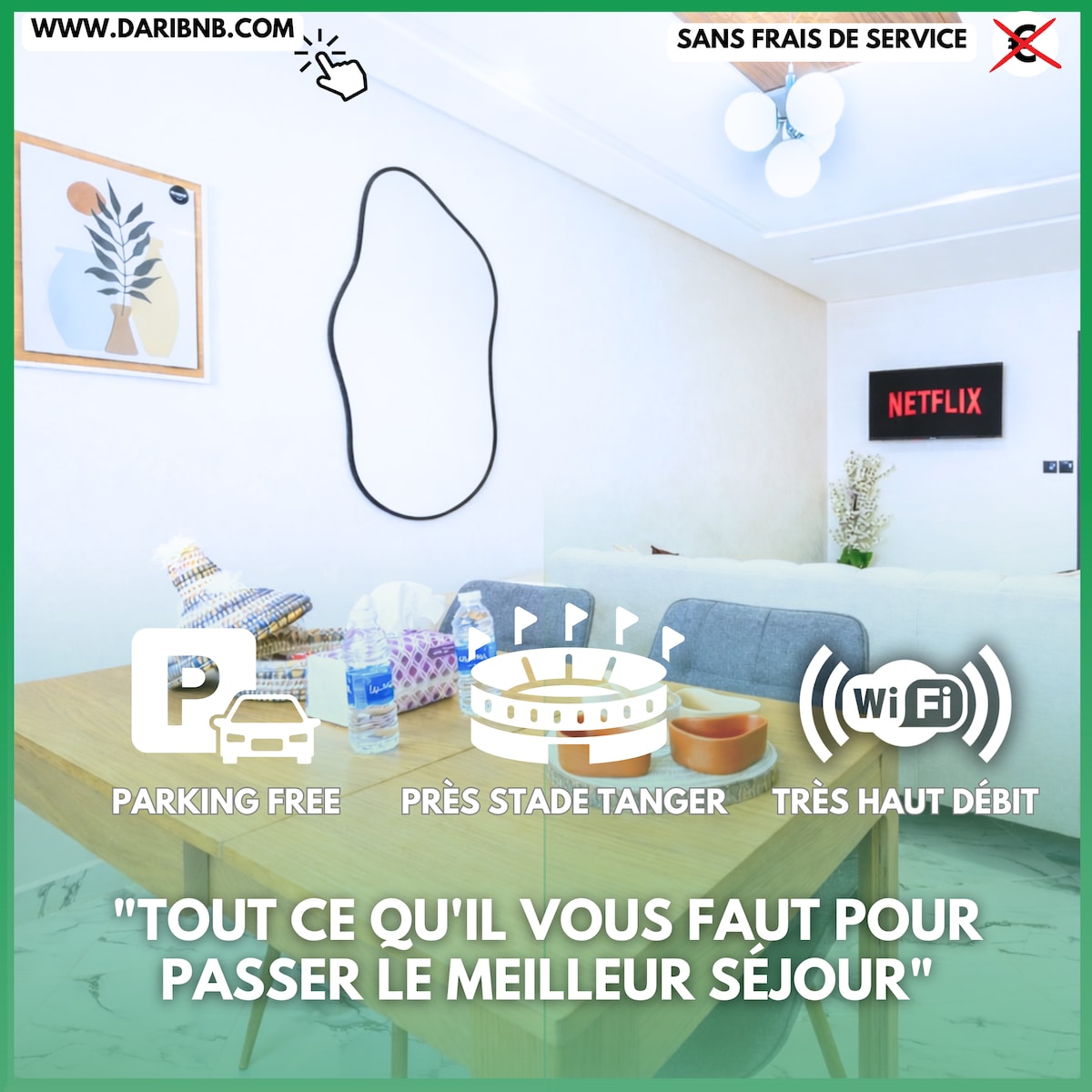 Bienvenido a Tánger, la comodidad y la modernidad te esperan en nuestro magnífico apartamento nuevo y cuidadosamente equipado Residencia con seguridad las 24 horas con guarda, cámaras de vigilancia y aparcamiento gratuito, ideal para viajeros que buscan comodidad y practicidad Disfrute de una estancia agradable con wifi, una cocina equipada y equipamientos pensados para familias y viajeros 5 min Estadio Ibn Batouta 9 min de Marjane A 3 min de la nueva estación de autobuses A 10 minutos del aeropuerto A 15 minutos de las playas