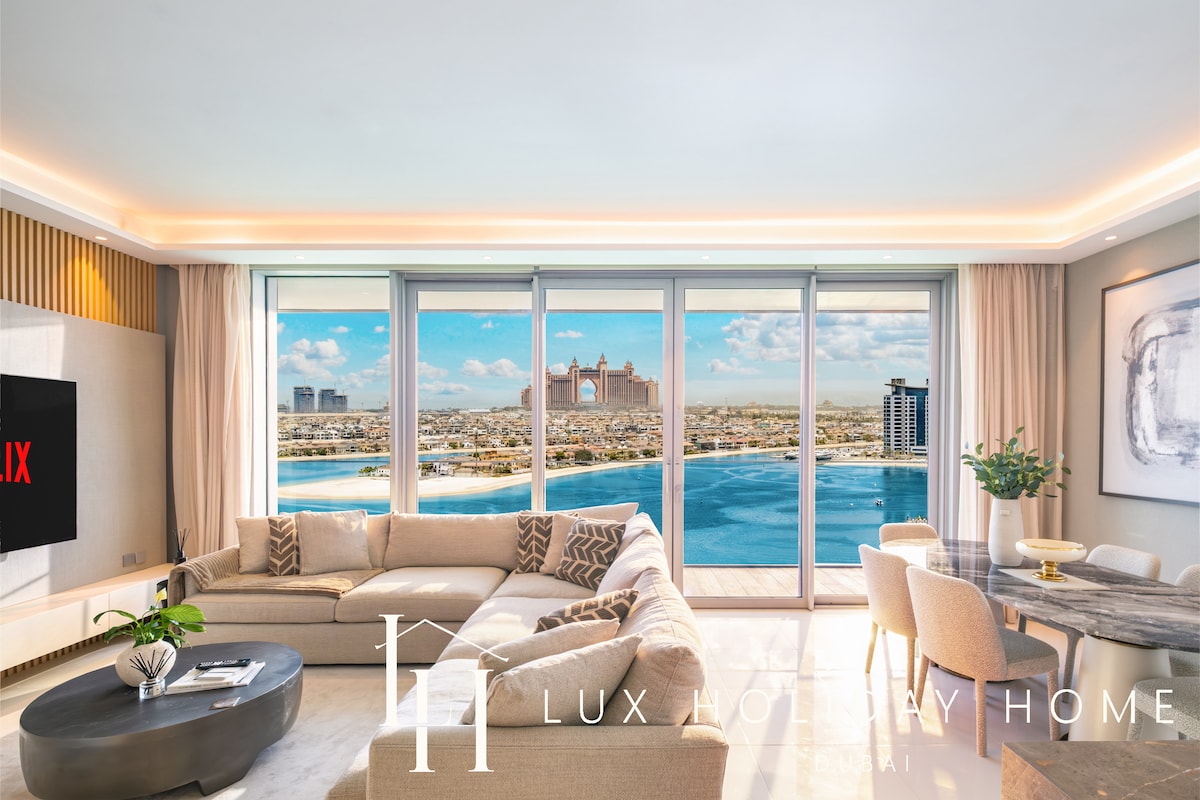 Bienvenido a LUX | La suite de lujo The Atlantis View Luxury Beach. Despiértate con vistas panorámicas de Palm Jumeirah en este luminoso y espacioso apartamento de 3 dormitorios frente a la playa. La sala de estar de planta abierta fluye hacia un amplio balcón, perfecto para disfrutar de la brisa marina. Con una ubicación ideal entre Dubai Marina y la icónica Palm, esta ubicación privilegiada ofrece una mezcla única de tranquilidad y comodidad urbana.
