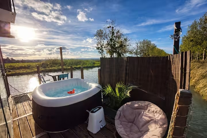 Casa rural flotante singular con jacuzzi privado y vistas al canal