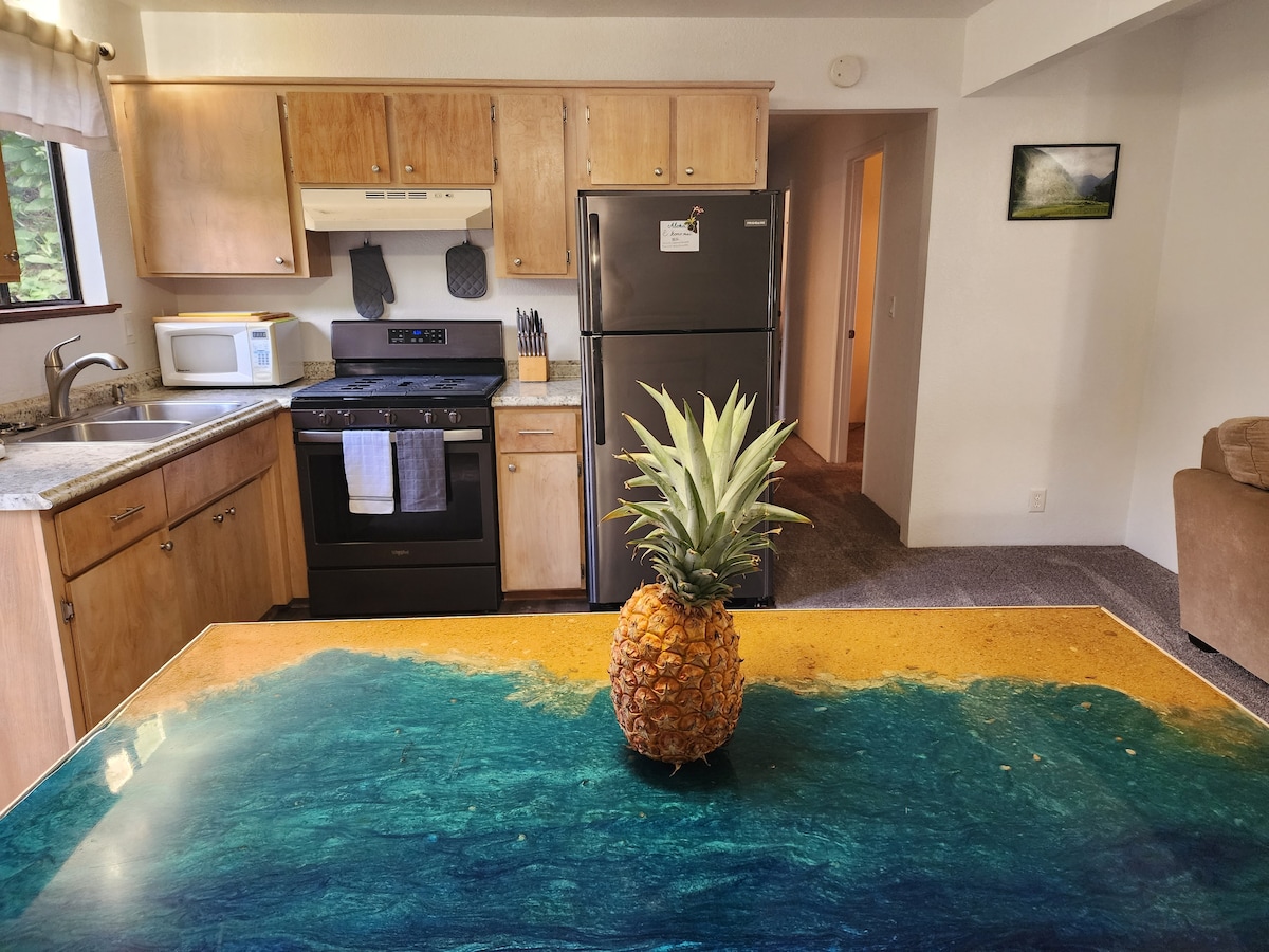 ¡Aloha, bienvenido a mi acogedora ohana! Ubicada a pocos minutos del aeropuerto y de algunas de nuestras playas más bonitas. Tiene 1 cama tamaño queen más un sofá. 2 vestidores. La cocina incluye nevera completa, microondas, horno tostador y placa calefactora. Hay wifi gratuito y una televisión inteligente para que puedas ver tu propio Netflix, Hulu, etc. Entrada privada y, oh, sí, la mejor parte... ¡aire acondicionado! Impuestos incluidos.