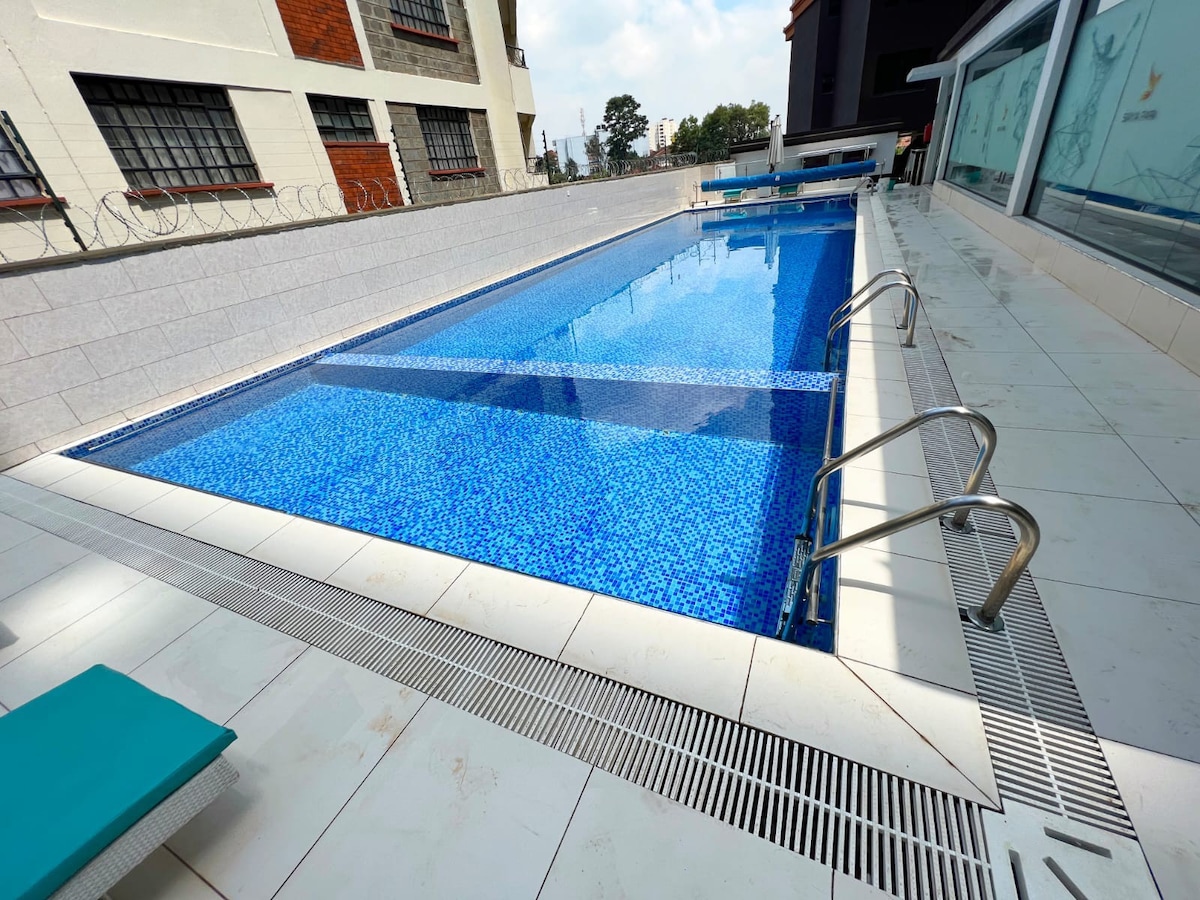 Este alojamiento único tiene personalidad propia. Este lujoso y espacioso apartamento está idealmente situado en los lujosos suburbios de Westlands con una variedad de restaurantes, escuelas, centros comerciales, hospitales y lugares de entretenimiento en un radio de 3 km. Cuenta con piscina climatizada en la azotea, sistemas de seguridad inteligentes, ascensores, generador de respaldo para áreas comunes, gimnasio en la azotea, servicio de limpieza, servicio de lavandería, conserje, Internet de alta velocidad, televisores inteligentes de 55 pulgadas, cama de gran tamaño y un hermoso patio.
