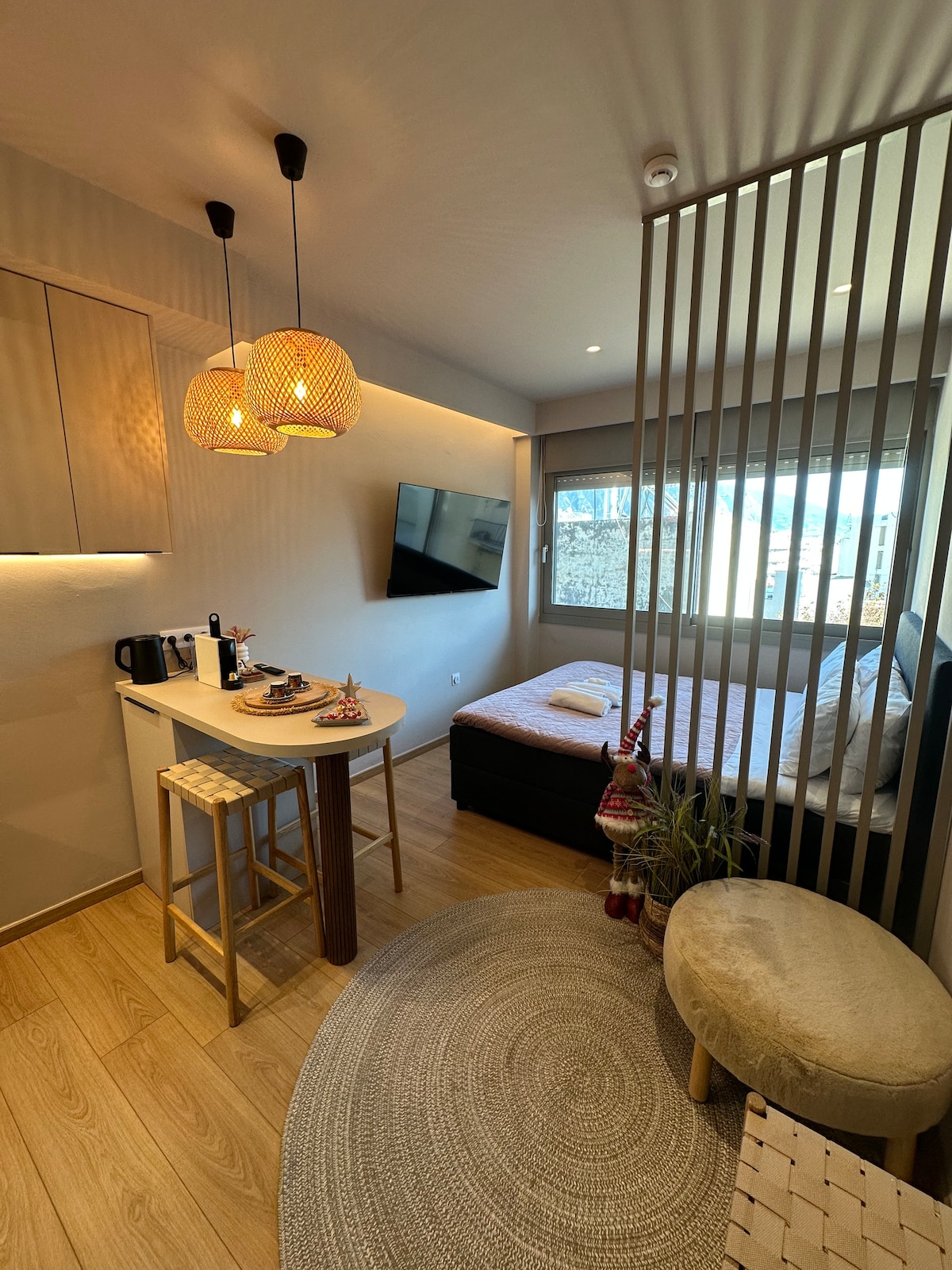 Disfrute de su estancia en un apartamento elegante, moderno y completamente renovado en el cuarto piso de un edificio de 5 plantas en el corazón de la ciudad de Kalamata. Dispone de: 1 dormitorio con cama de matrimonio y TV. Amplio salón con 1 sofá cama, TV Cocina totalmente equipada con comedor, cocina eléctrica, nevera, utensilios de cocina y vajilla. Baño con ducha y lavadora Balcón con vistas a la plaza central de Kalamata.
