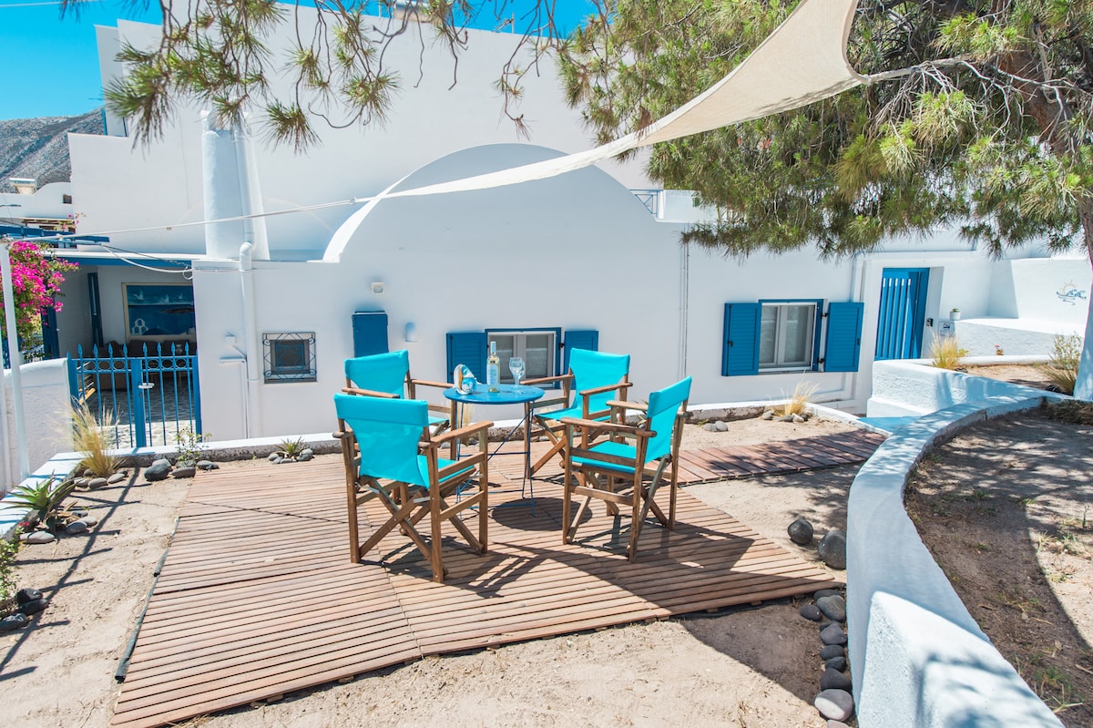 La casa es una pequeña casa cicládica muy típica con una excelente terraza que ofrece el ambiente fresco del espacio abierto, relajante y de vacaciones, de día y de noche. Tiene capacidad para 3 personas. Acaba de ser renovada con una piscina. En la gran habitación bien decorada hay dos camas, una doble y un sofá cama. Baño privado, cocina totalmente equipada y baño. La ubicación es privilegiada, a 5 minutos a pie de la famosa playa negra de Kamari y de la estación de autobuses a Fira.
