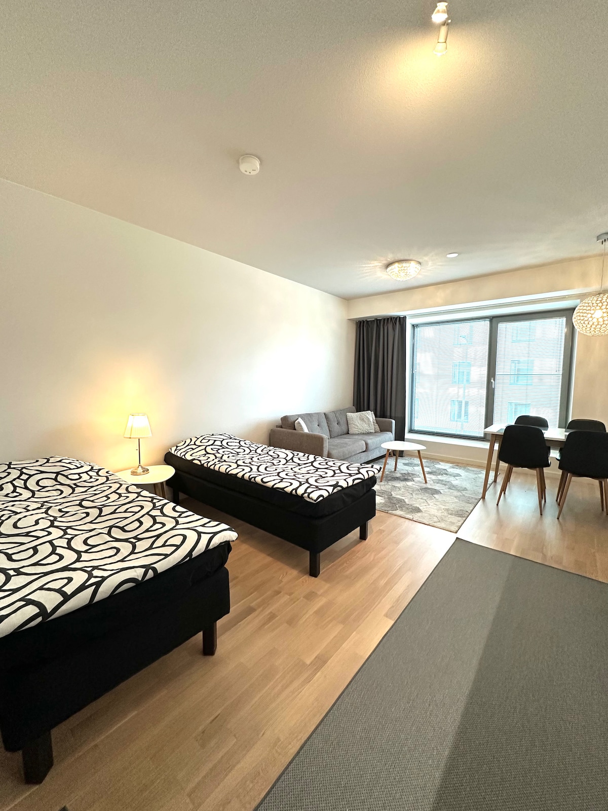 Acogedor apartamento de 74,5 m2 con aire acondicionado y 2 dormitorios con sauna en el estadio Tammela. Con el ascensor se puede acceder al aparcamiento, al supermercado y a los restaurantes. El apartamento cuenta con materiales y equipamiento de alta calidad y TV de 65 pulgadas con Netflix, así como con un amplio balcón (20 m²) con vistas al parque. Hay 1 plaza de aparcamiento gratuita en el aparcamiento cubierto y el transporte público está a la vuelta de la esquina. El centro de la ciudad también está cerca (1 km). Este alojamiento es bueno para viajes de negocios o para descansar de la vida cotidiana.