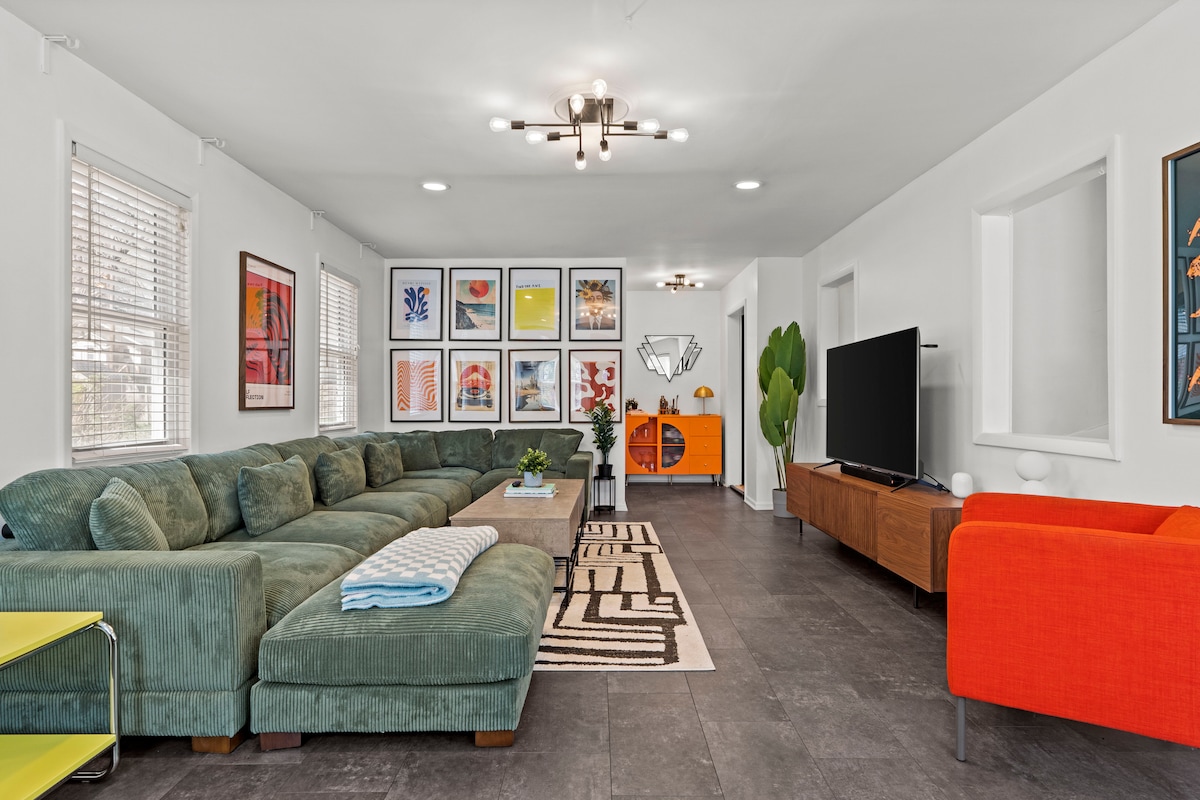 Tres dormitorios (uno con cama tamaño queen y cuatro con dos camas individuales), dos baños con azulejos, una litera con dos camas individuales y un sofá cama. La casa tiene capacidad para alojar cómodamente a nueve personas. Seis televisores inteligentes. ¡Se admiten perros! Patio trasero grande y vallado. Dos lavadoras y dos secadoras. El sótano es una sala de juegos dedicada y tiene una gran sala de juegos, mesa de billar, skee ball, futbolín, máquina de baloncesto, casa de Barbie y cocina de juegos. Docenas de juegos de mesa y juguetes al aire libre. Internet ultrarrápido. A 20 minutos en coche del aeropuerto y del centro comercial Legends Mall and Plaza.