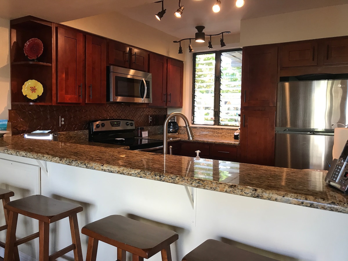 Kauai Kailani - Apartamento renovado en un complejo tranquilo ubicado en el lado este de Kauai, costa de cocos. Propiedad frente al mar, piso superior con techos abovedados y aire acondicionado fresco en ambas habitaciones. Ideal para lunas de miel o parejas que buscan un retiro tranquilo. A poca distancia a pie de los alquileres de bicicletas y del carril bici de Kapaa. Cocina totalmente equipada con tiendas de comestibles y alimentos saludables cruzando la calle. Equipo de playa para dos personas. Sin comisiones ocultas de resort ni de aparcamiento.