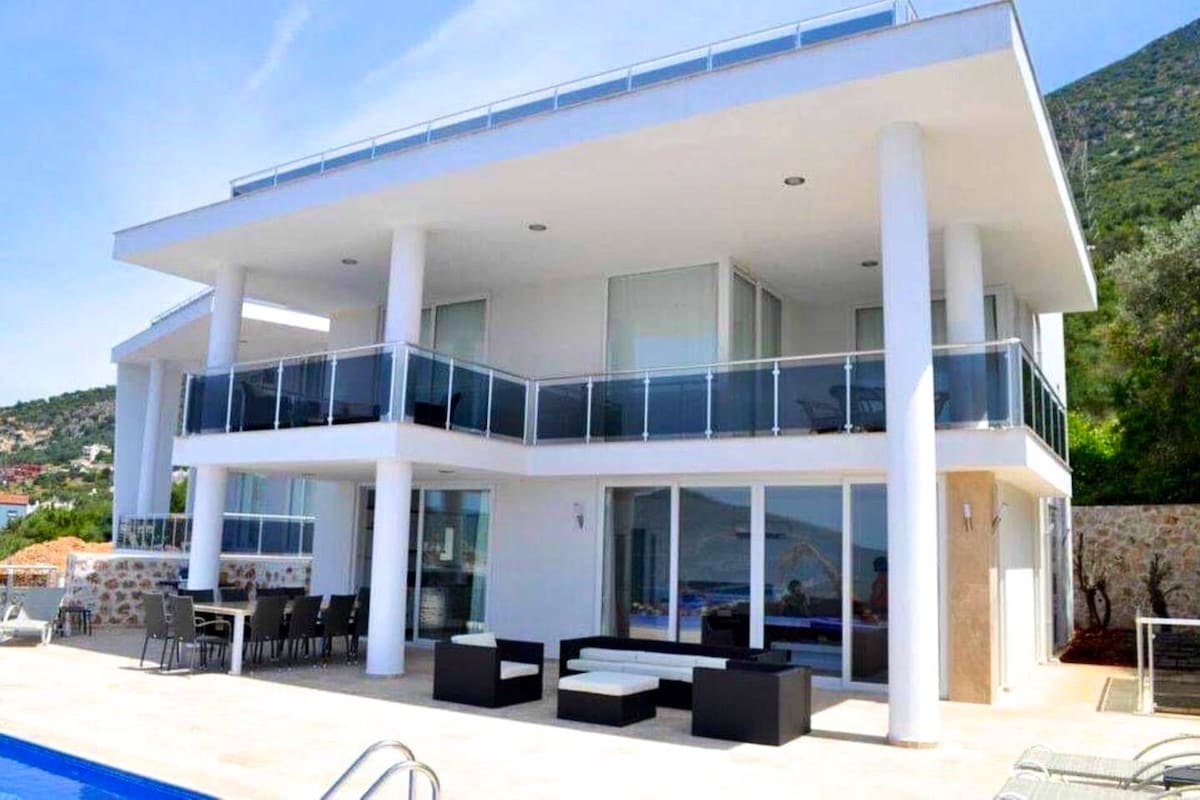 Diviértete con toda la familia en este elegante lugar de Kalkan con vistas panorámicas al mar. Gran comodidad: camas y cocina de calidad, muebles de lujo, TV de 65 pulgadas, gimnasio, mesa de ping pong y, por supuesto, excelentes vistas al mar. (Se ha añadido una sauna para 8 personas a la propiedad, las fotos llegarán en breve).
