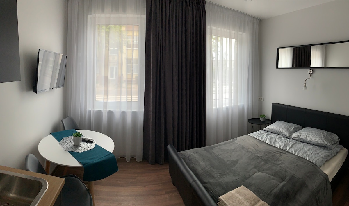 Apartamento de 1 dormitorio totalmente amueblado en el centro de la ciudad de Kaunas. A pocos minutos a pie de tiendas, bares, restaurantes y museos. A 15 minutos a pie de las estaciones de autobús y tren, a 10 minutos a pie del parque Azuolynas. El apartamento tiene 40 m2 y puede alojar cómodamente hasta 4 personas. Cuenta con una cama de 1,6 x 2 m en el dormitorio y un sofá cama extraíble en la sala de estar. La cocina está totalmente equipada con todo lo necesario para preparar tus comidas (nevera, lavavajillas, fogones, horno, hervidor de agua, microondas, etc.). Smart TV y wifi.