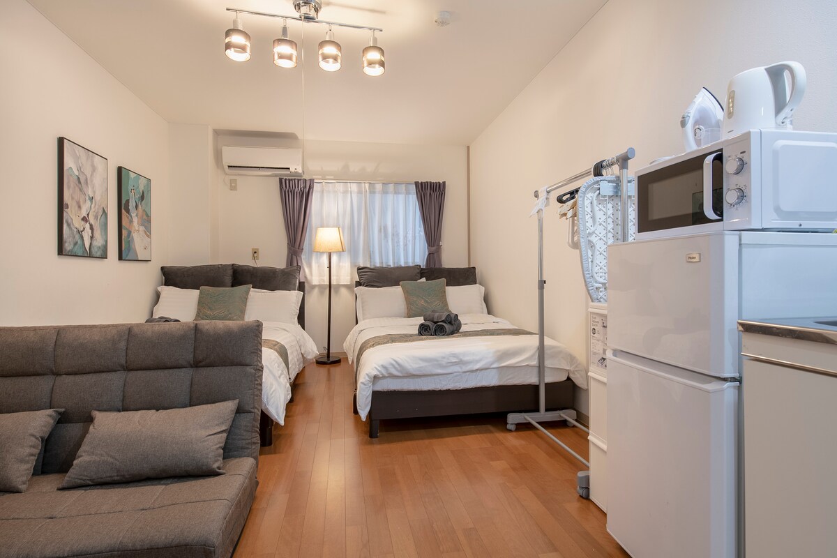 Es conveniente para toda la familia ir a cualquier lugar en este lugar céntrico. La habitación está amueblada con dos camas tamaño king, por lo que es ideal para familias y grupos de amigos. El espacio entre las camas es cómodo y la distribución permite disfrutar de un espacio privado.Adecuado para alojar hasta 5 personas. La cocina abierta está equipada con una placa de inducción, cazuelas, sartenes y platos, para que puedas cocinar fácilmente comidas caseras o platos japoneses sencillos. La barra comunica la zona de estar y el comedor, por lo que es perfecta para cualquier cosa, desde el café de la mañana hasta la cena. El lavabo y el baño están diseñados por separado, por lo que, aunque se hospeden varias personas juntas, cada una puede seguir su propio ritmo. Disfrutar de un estéreo Bluetooth, escuchar música y tomar un baño caliente por la noche en Japón es el momento más relajante del viaje. La sala está equipada con un proyector que se puede conectar fácilmente a las principales plataformas de streaming digital. Totalmente equipado con lavadora, purificador de aire, plancha y un armario espacioso; tenemos todo lo que necesitas. El espacio es ideal, perfecto para que una persona trabaje tranquilamente en la barra de la cocina, o para pasar unos días con amigos o familiares. Nos lo pasamos muy bien y todo el mundo estaba cómodo.