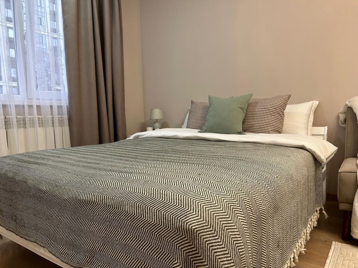 Diviértete en nuestro acogedor y elegante alojamiento. Estudio moderno y funcional en la ciudad de Almaty para 2-4 personas. Se admiten bebés y niños. El alojamiento entero recién reformado tiene todo lo necesario para que tu estancia sea cómoda. El apartamento tiene cocina totalmente equipada, wifi y todas las comodidades necesarias. El apartamento está situado junto al gran centro comercial con una gran variedad de restaurantes, cafeterías y un supermercado. La calle principal City Walking está a 10 minutos a pie.