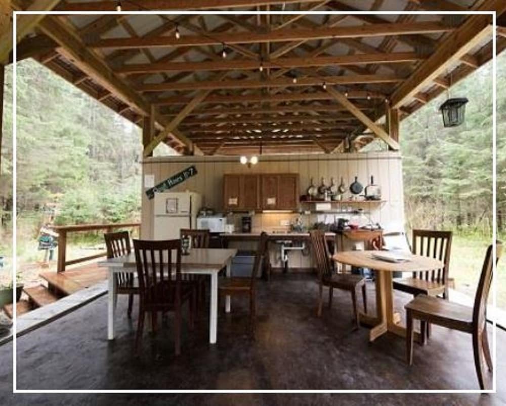 ¡Prueba algo diferente y alójate en una de nuestras nuevas yurtas! Estos cómodos alojamientos están enclavados en el bosque en un ambiente de cuento de hadas. Esta yurta tiene una cama tamaño queen y una cama individual, tragaluz que mira hacia el dosel del árbol, electricidad, calentador/ventilador y baños compartidos. Un pabellón cubierto ofrece varias mesas de pícnic, parrilla para barbacoa y un área de fogata cercana. Las yurtas son realmente una experiencia de "glamping" de Alaska. También ofrecemos un 10-15% de descuento en cruceros de glaciares y ballenas.