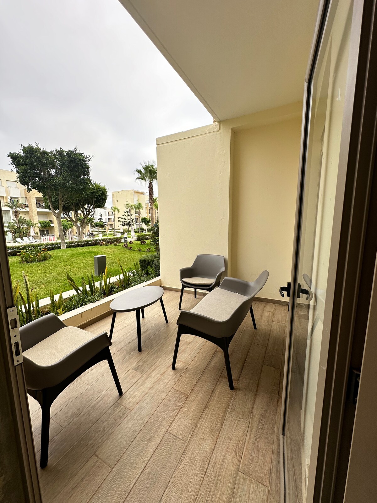 Apartamento tranquilo en una ubicación tranquila cerca de Rabat. El apartamento está en primer piso y cuenta con jardín privado. Lo mejor de este lugar es la vista directa al mar. Puedes ver la puesta de sol desde la sala o la terraza. El apartamento está a unos 25 minutos en coche del aeropuerto de Rabat/Sale. Tienes posibilidad de utilizar la piscina comunitaria, que está a 30 metros del apartamento. La playa está a 3 minutos a pie.