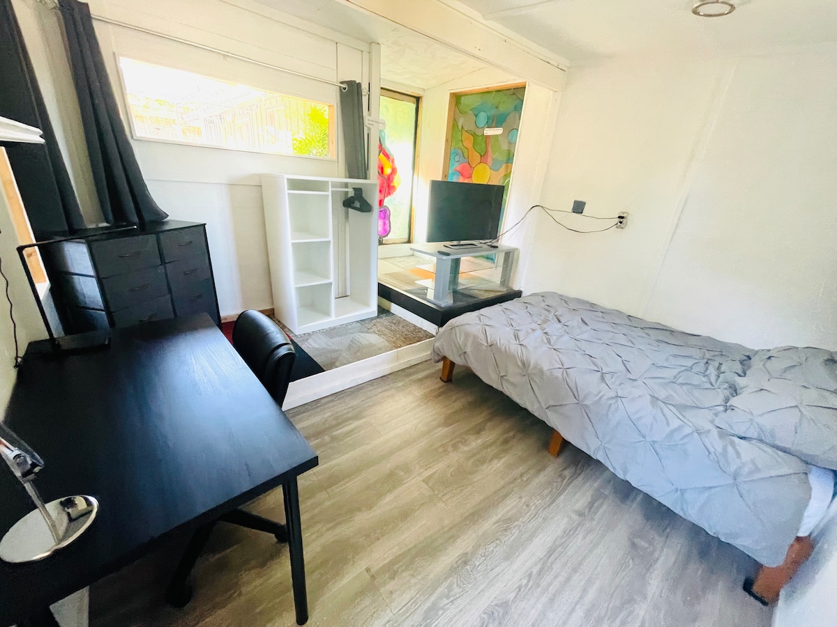 La minicasa privada total, limpia y acogedora, ubicada en mi propiedad junto a mi casa principal. Baño privado, dormitorio /cama tamaño queen, sala de estar, cocina con sartén eléctrica La minicasa tiene nevera de buen tamaño y TV inteligente. Los huéspedes tienen acceso a un cenador con barbacoa y chimenea. Desde la minicasa es de fácil acceso al transporte público: las paradas de autobús están al otro lado de la calle y otros 500 pies de casa. A poca distancia a pie de varios restaurantes, tiendas de alimentación, oficina de correos, parque.