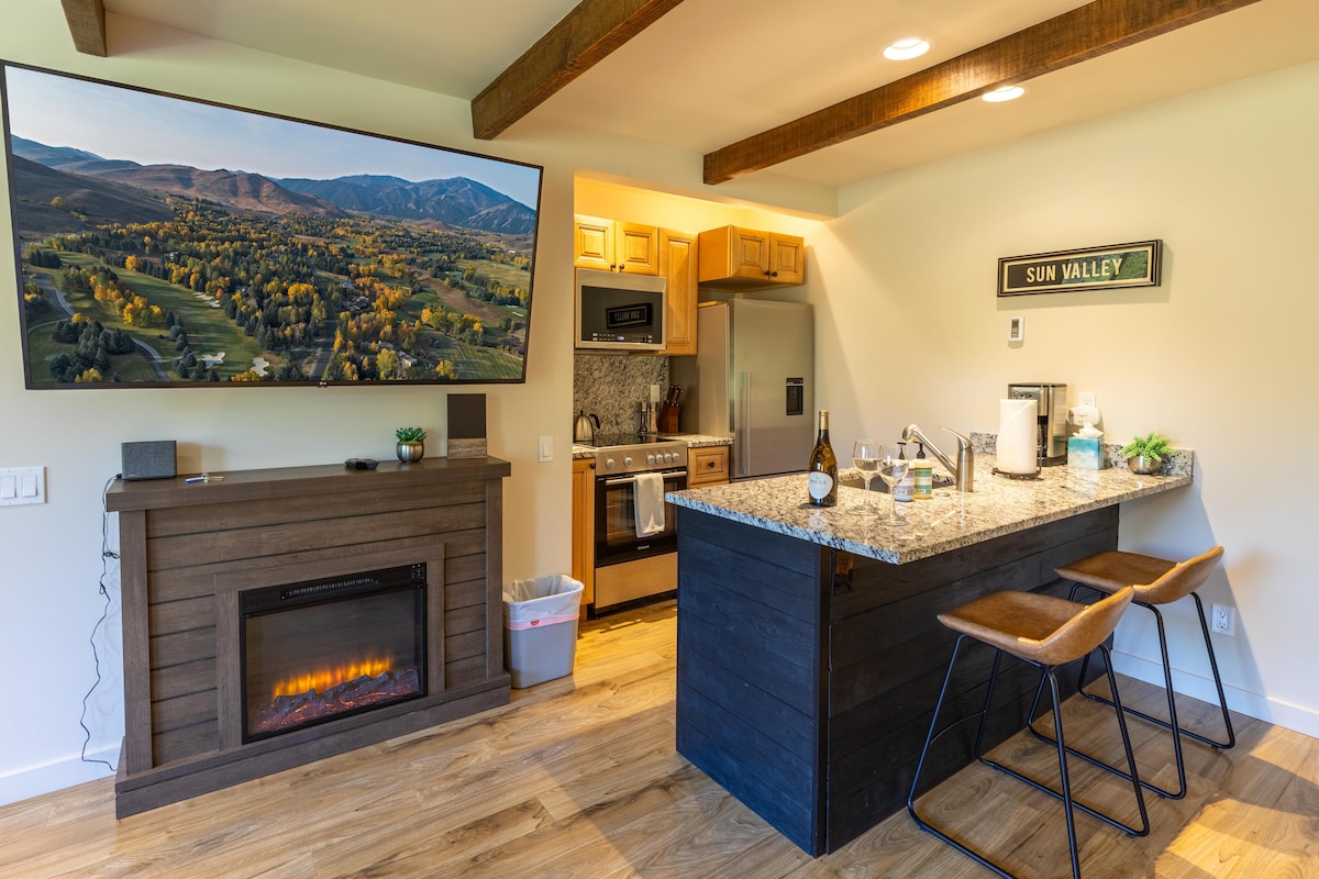 ¡Ven a disfrutar de la increíble zona de Sun Valley/Ketchum! Nuestro apartamento está situado directamente entre el esquí y la vida nocturna. A solo 2 manzanas a pie del esquí en la base de River Run de Bald Mountain, o a 2,5 manzanas a pie de los mejores restaurantes, bares y tiendas que Ketchum tiene para ofrecer. Este estudio de buen gusto, recientemente remodelado, tiene una puerta corrediza de vidrio que da a una terraza con vistas a la majestuosa montaña Bald. ¡Nuestro acogedor apartamento es el alojamiento perfecto para tu escapada a Idaho durante cualquier temporada!
