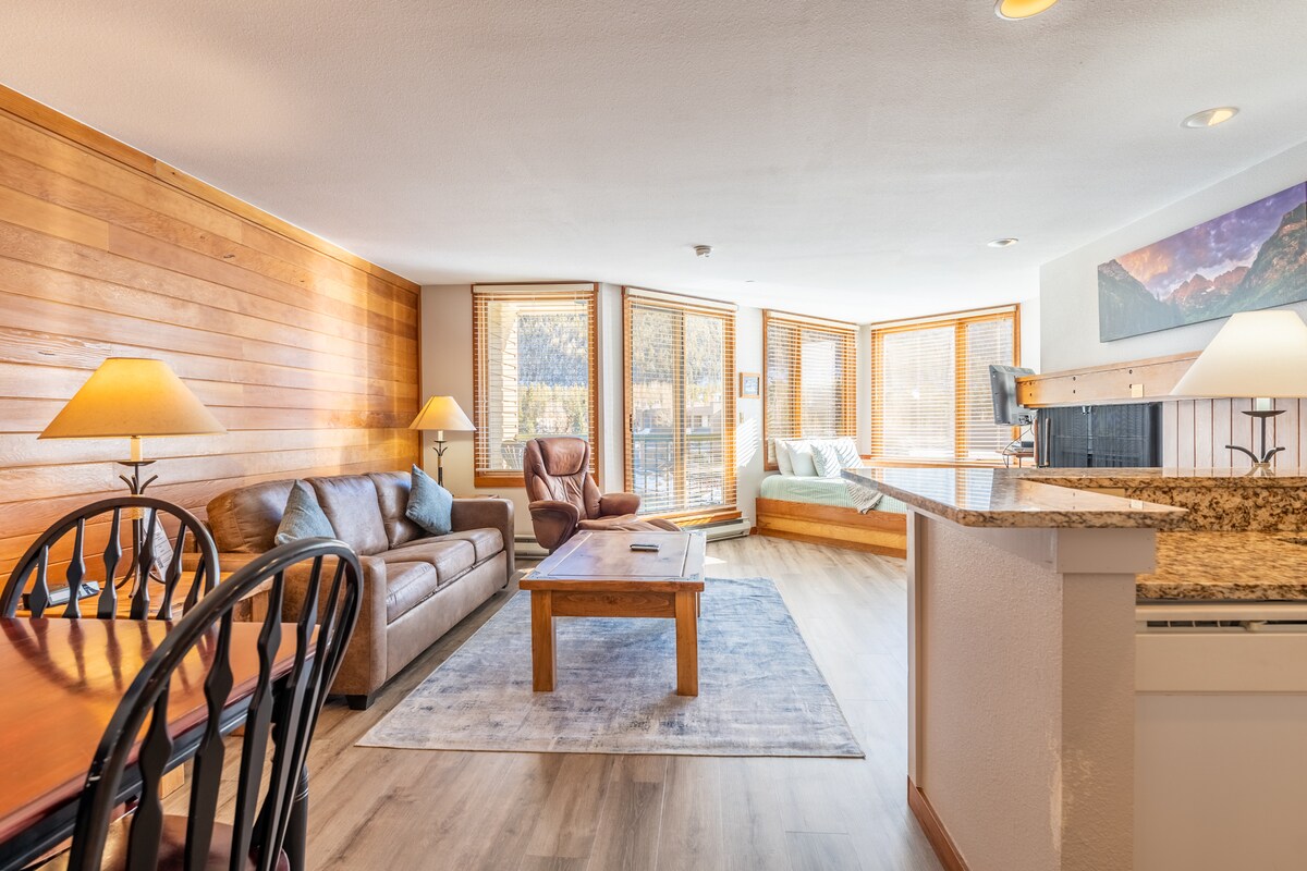 Bienvenido a Buffalo Lodge Condo, un acogedor refugio en Keystone's River-Run Village, a pocos pasos de los remontes. Disfruta de comodidades modernas, como una plaza de aparcamiento con calefacción (1) y fácil acceso a pistas de esquí y rutas de ciclismo. Nuestro encantador apartamento tiene capacidad para 4 personas, con una cama tamaño king y un sofá cama tamaño queen plus, y ofrece impresionantes vistas a la montaña para despertar. A solo 5 minutos en coche del lago Dillon y a 10-45 minutos de Breckenridge, Copper Mountain, A-Basin, Loveland, Vail y Beaver Creek.