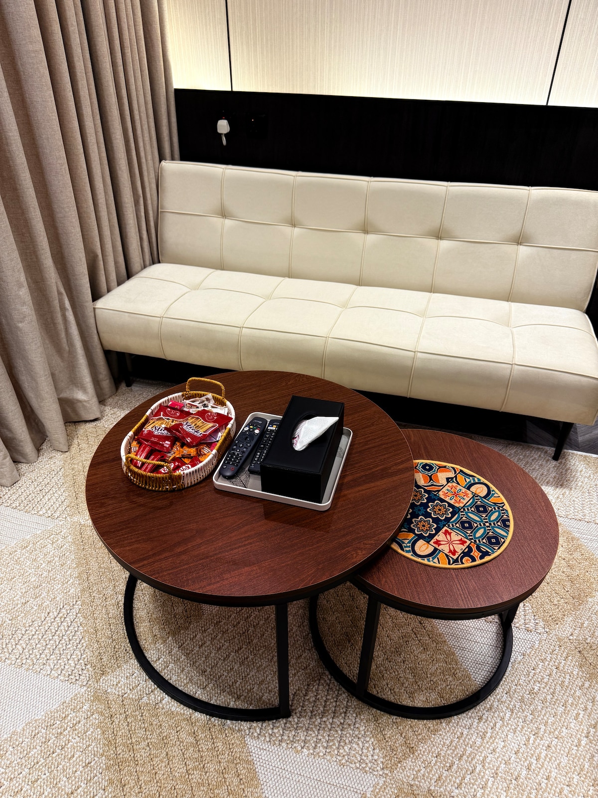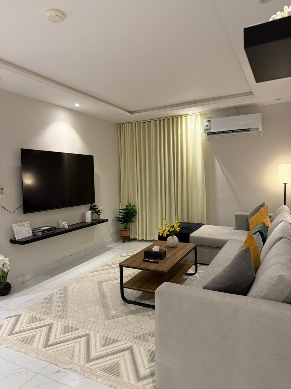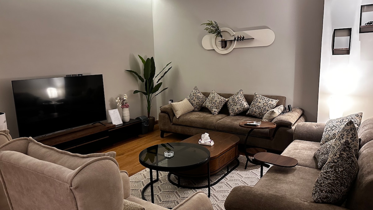 Dormitorio, salón y cocina Diseñado con muebles tranquilos y agradables a la vista que te hacen que te sientas cómodo y en calma 🛏️ Cama doble 🛋️ Sofá cómodo 📺 Pantalla de 75 pulgadas 🚿 Baño limpio con una potente ducha de efecto lluvia Comodidades adicionales: • Acceso independiente para mayor privacidad • Toallas de un solo uso para la higiene y el cuidado • Suscripción gratuita a Netflix • YouTube Premium sin anuncios • Suscripción a Shahid VIP • Champú, jabón y loción corporal Características del sitio: 📍 En el corazón de Riad 🚗 A 2 minutos del hospital militar A 🚗 4 minutos de la Ciudad Médica Rey Fahd A ✈️ 25 minutos del aeropuerto 🛒 Cerca de todos los servicios de ocio y restauración