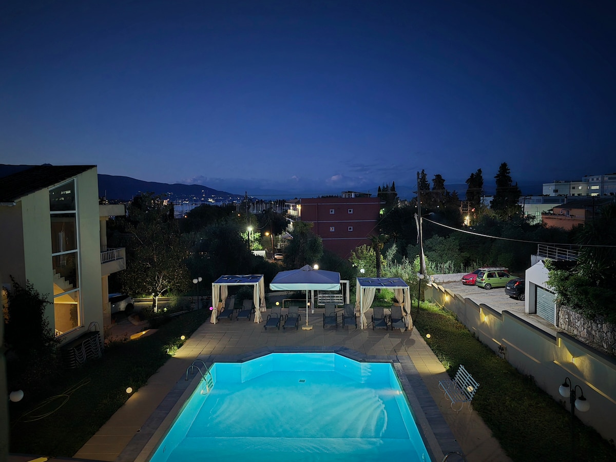 Villa Xenonerantzia se encuentra a 10 km de la ciudad de Corfú y del aeropuerto, a 3 km del pueblo de Gouvia, en el centro de Corfú. Está en una colina, con una vista maravillosa al mar y al casco antiguo. La zona es tranquila y su ubicación en el centro de la isla es ideal para un acceso rápido a las playas del este y del oeste. A 5 minutos hay supermercados, varias tiendas, restaurantes y el puerto deportivo de Gouvia. La casa tiene 260 metros cuadrados, con habitaciones espaciosas y totalmente equipadas. ¡Tiene un ambiente mágico!