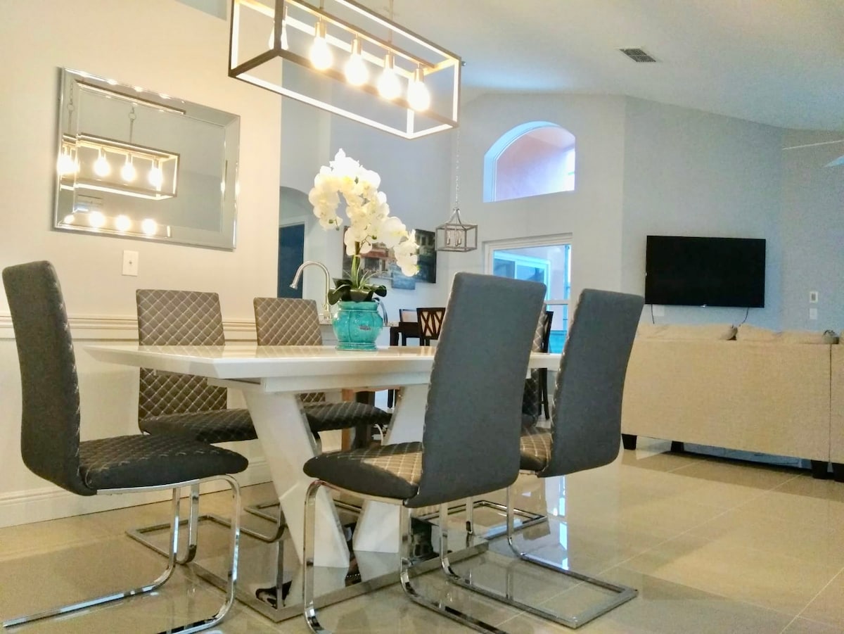 Relájate y disfruta de unas vacaciones tranquilas con familiares y amigos en nuestra preciosa casa a solo 3 millas de Disney World. Nuestra sala de juegos recién renovada está equipada con 4 máquinas arcade, mesa de billar y hockey de aire. Disfruta de la piscina privada y de una cocina totalmente equipada. Casa inteligente recientemente mejorada con luces LED de colores inteligentes en todas partes. Nuestra comunidad es la más cercana a Disney y otros parques temáticos. Estamos ubicados a 6 minutos de atracciones, restaurantes y tiendas. Spa/sauna disponible en la casa club. Piscina recién reformada.