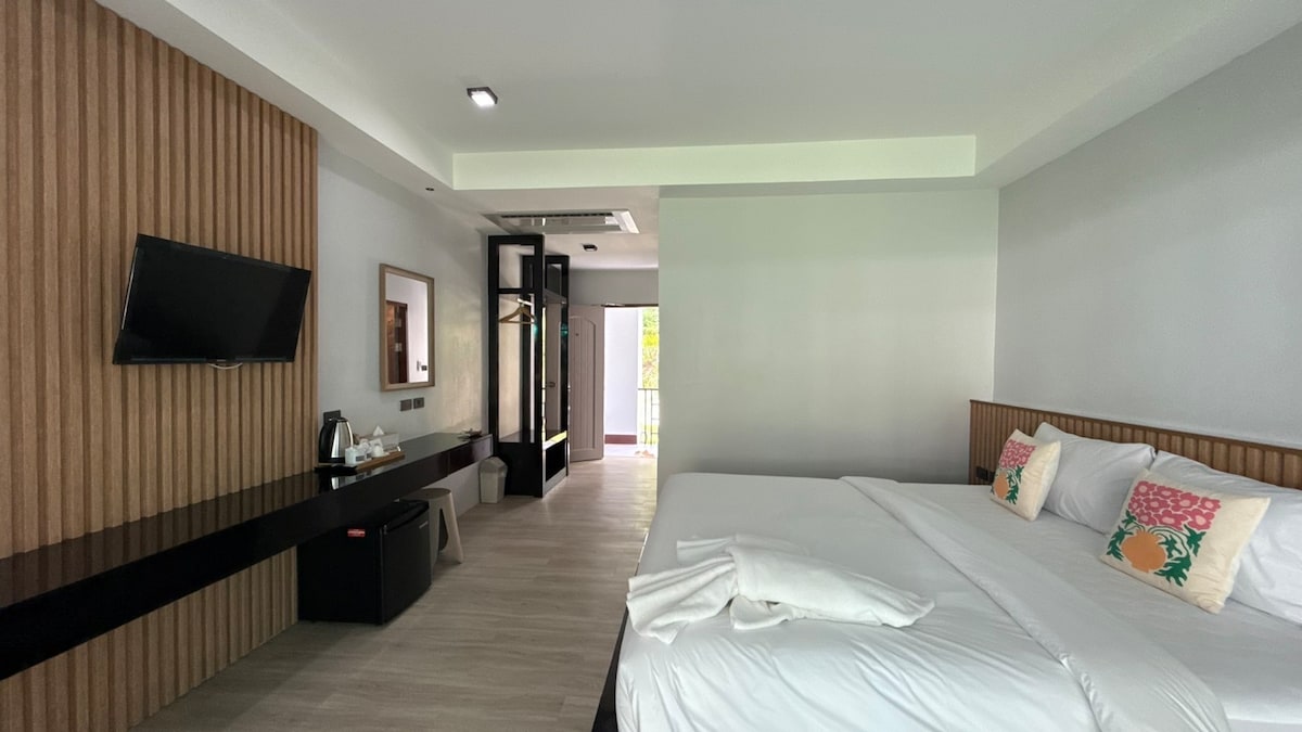 Prime beachfront location on Railay! This guest room is offered by Railei Beach Club and all services of the Club are available to you. It has a king bed, private bathroom & covered outdoor shower and mini fridge. Make fresh coffee or tea, with a Bodum coffee press on the shared deck. Free clean drinking water is also available. Out your door is a large communal deck space with tables, chairs, and loungers and a spectacular view looking out towards the garden area and Railay Beach.