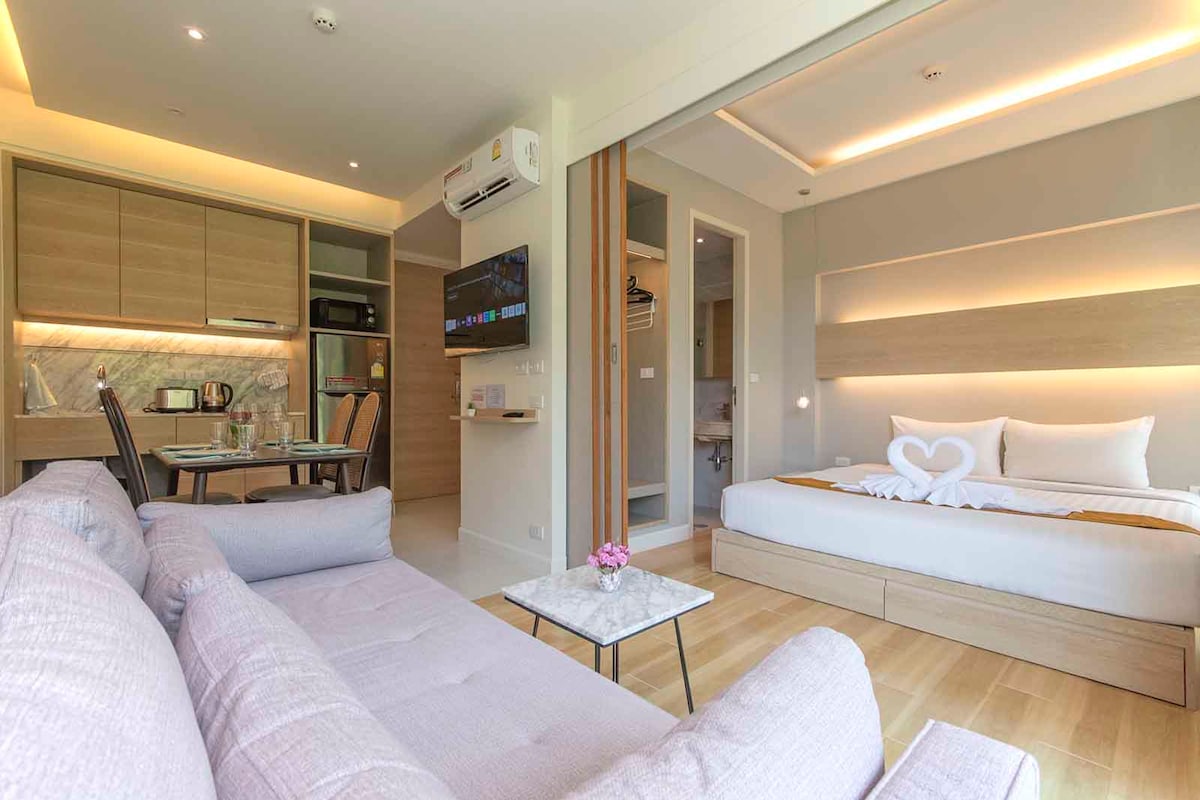Disfruta de una experiencia elegante en este apartamento céntrico ubicado en el último piso del complejo principal de Ao Nang, Rocco Ao Nang. El apartamento ático de 35 metros cuadrados está lujosamente equipado con todo lo necesario para una estancia cómoda junto con tu propia conexión personal a Internet de fibra de alta velocidad. A poca distancia a pie de las playas (5 minutos), muelles de barcos y todos los restaurantes y bares. Los huéspedes pueden utilizar el gimnasio, la piscina y la sauna. Aparcamiento in situ para bicicletas y coches.