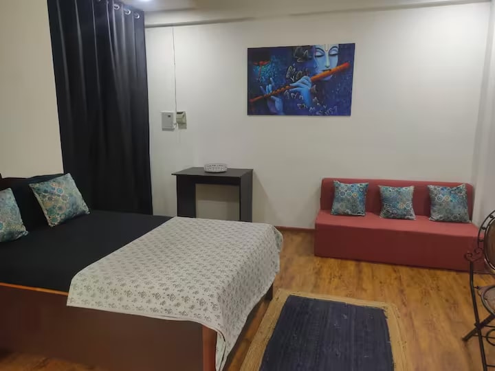 Alójate en Bhakti Vanam, a solo 1,5 km del sagrado Prem Mandir en Vrindavan. Disfruta de un amplio estudio con aire acondicionado, wifi de alta velocidad, entrada privada y un acogedor balcón. Perfecto para dos huéspedes, con una cama supletoria disponible si es necesario. Cómodo para ir a los templos y al transporte público, y se pueden organizar alquileres de escúteres. Acceso completo a una cocina bien equipada y un baño limpio. Ideal para familias o viajeros solitarios que buscan comodidad y paz en un lugar espiritual.