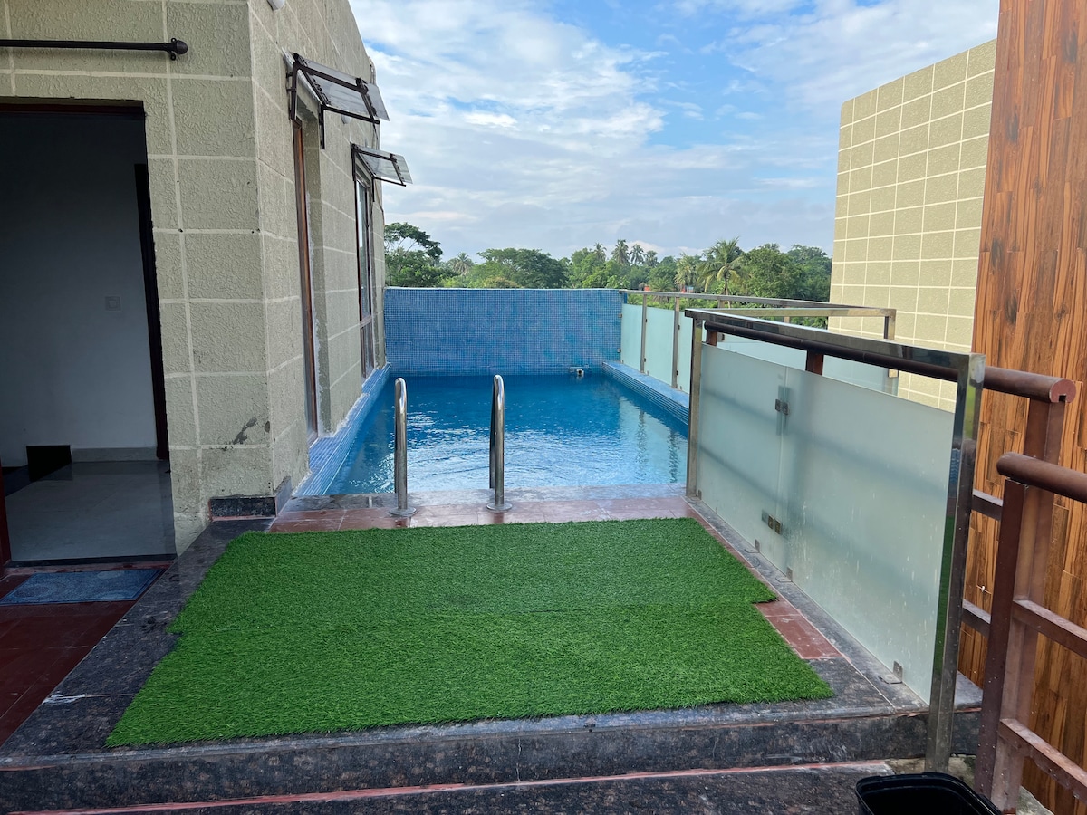 Olvídate de tus preocupaciones en este espacio amplio y sereno. Es un increíble establecimiento de alojamiento familiar en la India (aprobado por el Ministerio de Turismo, Gobierno de la India). Cuenta con piscina privada y terraza con vistas a un campo de golf. Fuera de la multitud de la ciudad. Se puede caminar hasta el adyacente resort de cinco estrellas Vedic Village con spa, restaurante, cafetería, naturoterapia, etc. A cuarenta minutos en coche del aeropuerto internacional NS Bose, Calcuta(15 km). Se puede llegar a atracciones cercanas como el parque ecológico, el museo de cera, el parque Nicco a 20 minutos en coche.