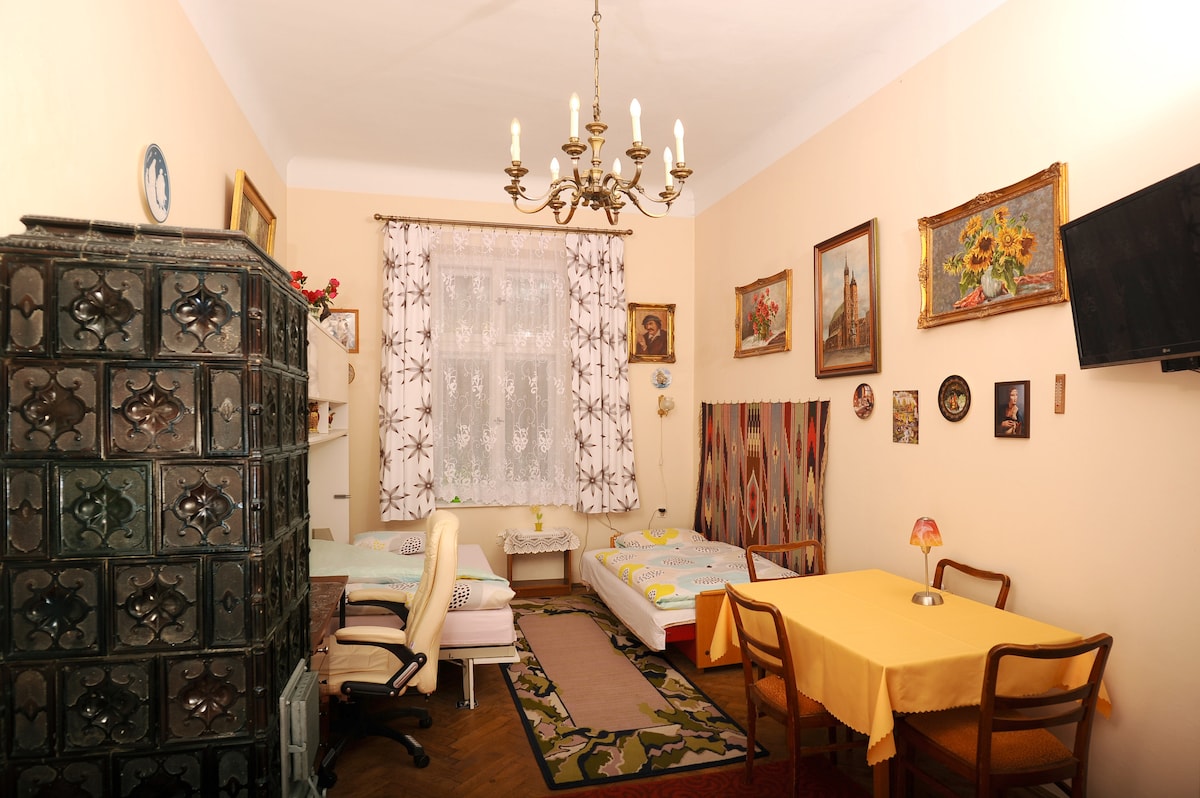 Relájate en un antiguo sofá cabriol en una sala de estar llena de luz adornada con alfombras de piel de oveja y muebles vintage. Los detalles reciclados y los toques minimalistas dan un ambiente ecléctico a este espacio remodelado. El apartamento está situado en una casa de vecinos del siglo XIX, en el casco antiguo, entre la plaza principal y el antiguo barrio judío. Pasea por las calles de aspecto especial bordeadas de tiendas de antigüedades peculiares, intrigantes galerías de arte y cafés de estilo shabby-chic.