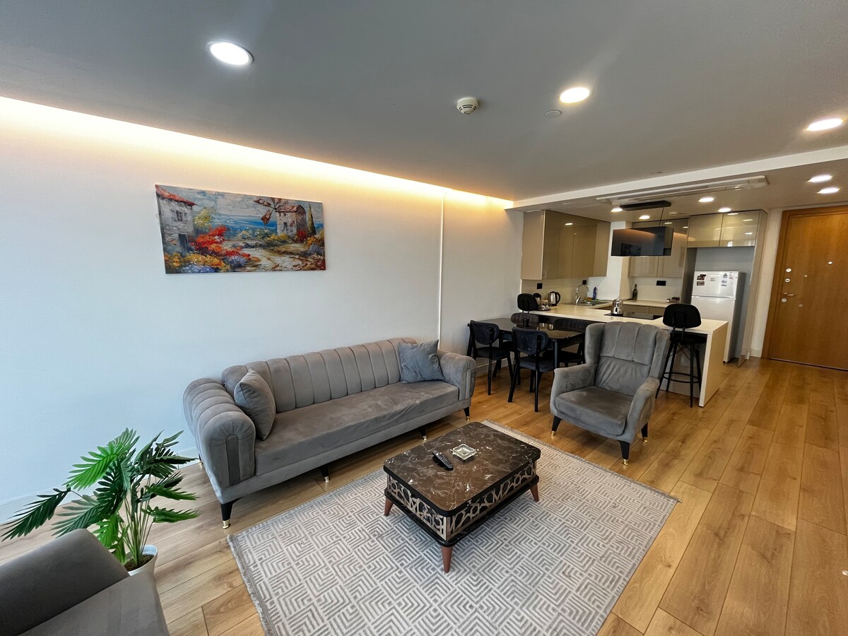 Un moderno y elegante apartamento de dos dormitorios en una nueva residencia cerca de 212 outlet y centro comercial de Estambul que ofrece a los huéspedes la estancia más relajante con un alto nivel de seguridad. Los huéspedes disfrutarán de un apartamento nuevo y espacioso con ventanas en el techo que iluminan el espacio con mucha luz natural. El espacio cuenta con servicios de 5 estrellas y está equipado para satisfacer todas las necesidades de los huéspedes, como lavavajillas, calefacción, lavadora, TV, WIFI, sistema de calefacción central y varias otras comodidades.