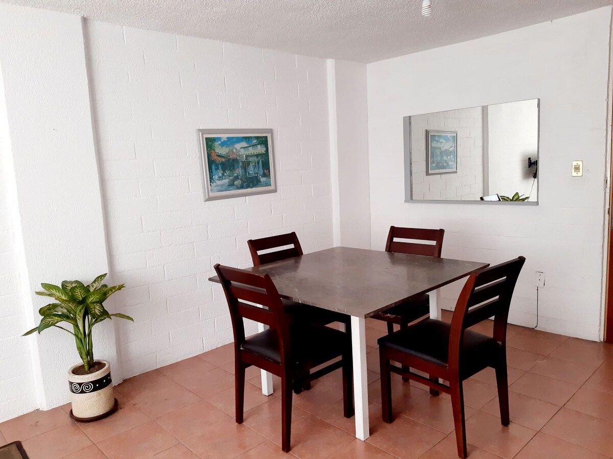 El departamento se encuentra dentro de la unidad habitacional Torres Tlalpan, es un lugar muy tranquilo y con excelente ubicación. El departamento es uso exclusivo para los huéspedes, no se comparte. Se encuentra muy cerca de la zona de hospitales, metrobus y camiones que van al metro Taxqueña, CU, centro histórico y estadio azteca. Por favor de avisarme entre 20 o 30 min antes de que vayan a llegar.