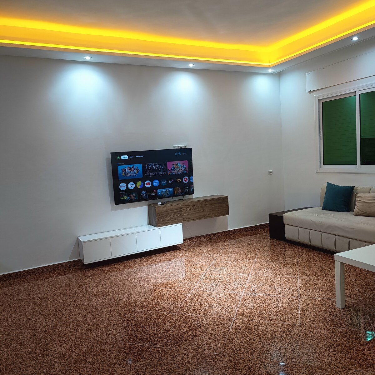 Bienvenue dans ce charment appartement au rdc situé à Tanger, idéalement placé à proximité de la plage, de la foret et de l'aéroport. Parfait pour les séjours en famille, ce logement spacieux peut accueillir jusqu'à 6 personnes. La cuisine est équipé pour préparer vos repas comme à la maison. Profitez du WI-Fi gratuit, d'une TV, d'une machine à laver, et d'un parking sécurisé au sein de la résidence. Salle de bain fonctionnelle, linge de maison fourni. Couples musulmans non mariés non admis.