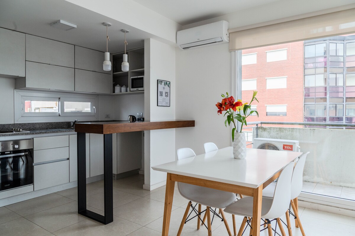 Te va a encantar este espacio por su calidez, la ubicación, el ambiente y el balconcito con su vista. Es ideal para parejas o viajeros solos ya sea de vacaciones, trámites o trabajo. El edificio es tranquilo de seis pisos, está frente a playa Alfonsina y a 100 metros de la plaza España. Hermosa zona con variadísimos locales comerciales y bares cercanos... y la costa enfrente.